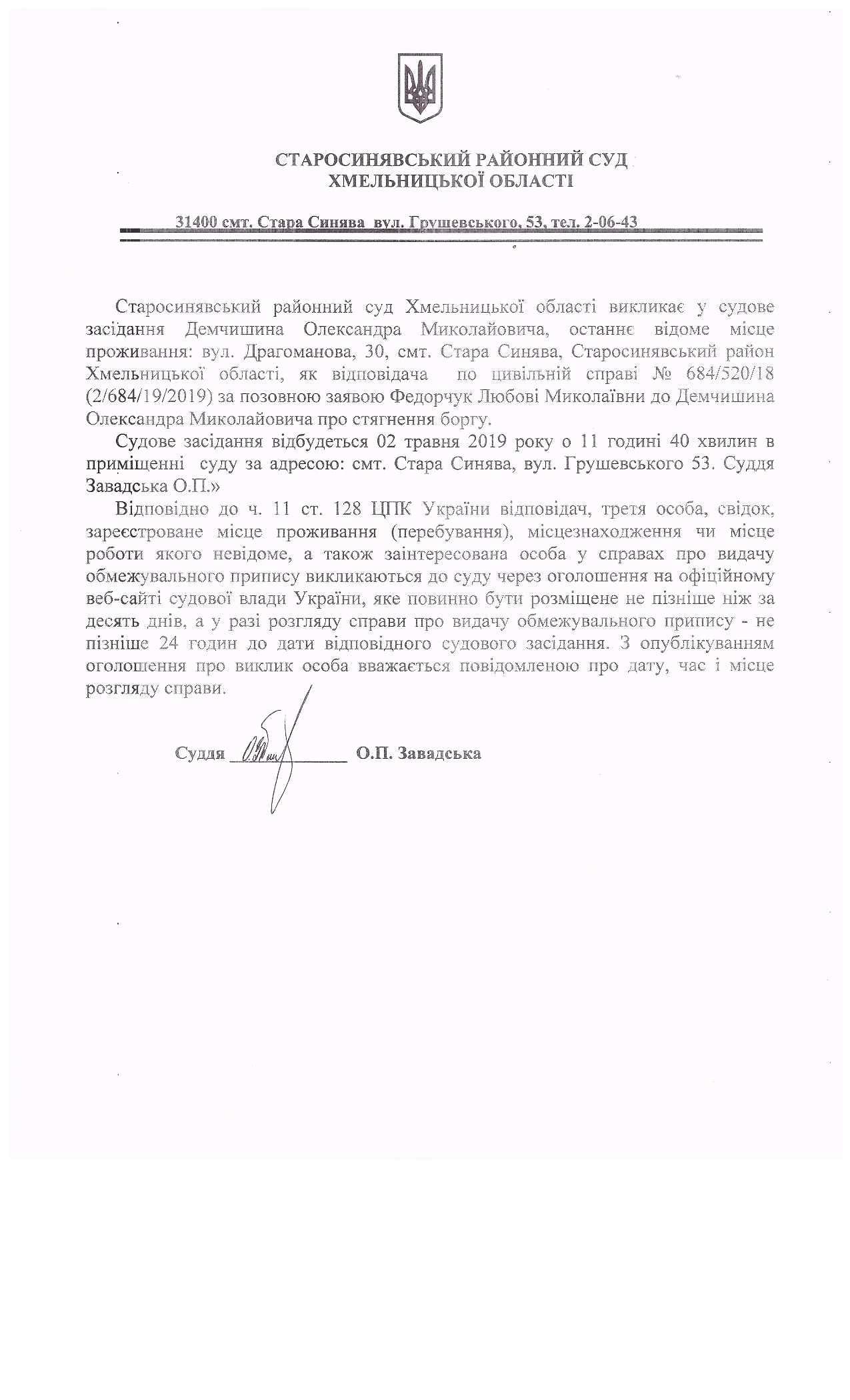Оголошення про виклик до суду Демчишина Олександра Миколайовича