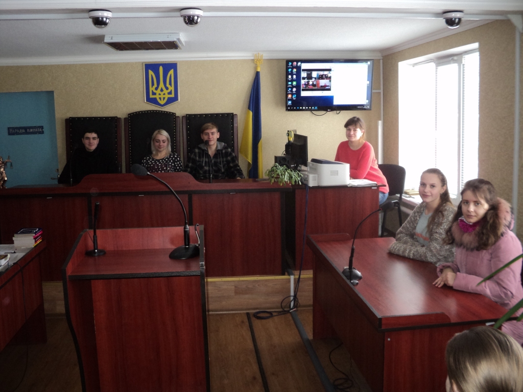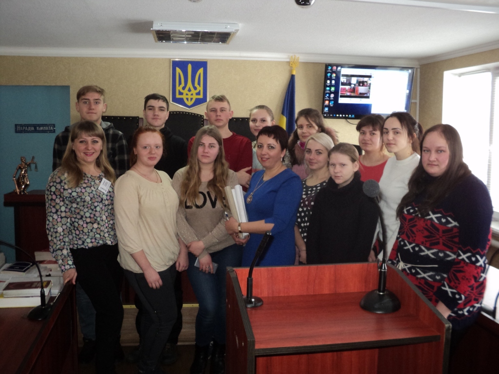 Зустріч розпочалася з екскурсії приміщенням суду та ознайомленням з роботою працівників суду. Після чого всіх було запрошено до зали судових засідань, де помічник голови суду (прес-секретар суду) Горбатко Світлана Олексіївна провела бесіду з учнями, під час якої роз’яснила порядок надання та отримання інформації та звернення до суду, про що слід пам`ятати під час перебування в суді, як поводити себе під час слухання справи, розповіла про категорії справ, які розглядаються судом та законодавство, що регулює їх розгляд. Коротко ознайомила студентів з основними кодексами України.