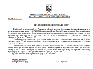 Канівський міськрайонний суд Черкаської області викликає Кравченка Олексія Вікторовича в якості відповідача по справі № 697/1345/18 за позовом Шупан Олени Костянтинівни до Кравченка Олексія Вікторовича про позбавлення батьківських прав та стягнення аліментів на неповнолітню дитину в судове засідання, яке відбудеться 07.09.2018 року о 08 год. 30 хв. в приміщенні суду за адресою: Черкаська область, м. Канів, вул. Успенська, 22.
