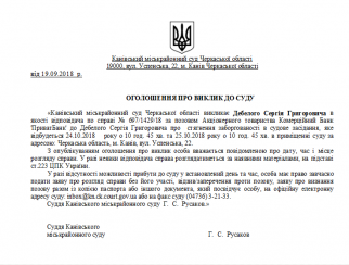 Канівський міськрайонний суд Черкаської області викликає Дебелого Сергія Григоровича в якості відповідача по справі № 697/1429/18 за позовом Акціонерного товариства Комерційний Банк 'ПриватБанк' до Дебелого Сергія Григоровича про стягнення заборгованості в судове засідання, яке відбудеться 24.10.2018 року о 10 год. 45 хв. та 25.10.2018 року о 10 год. 45 хв. в приміщенні суду за адресою: Черкаська область, м. Канів, вул. Успенська, 22.