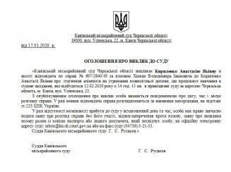 Канівський міськрайонний суд Черкаської області викликає Кириленко Анастасію Яківну в якості відповідача по справі № 697/2840/19 за позовом Хижки Володимира Івановича до Кириленко Анастасії Яківни про стягнення аліментів на утримання повнолітньої дитини, що продовжує навчання в судове засідання, яке відбудеться 12.02.2020 року о 14 год. 15 хв. в приміщенні суду за адресою: Черкаська область, м. Канів, вул. Успенська, 22.