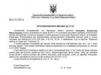 Канівський міськрайонний суд Черкаської області викликає Клименка Владислава Вячеславовича в якості відповідача по справі № 697/57/20 за позовом Заступника керівника Золотоніської міцевої прокуратури в інтересах держави в особі Канівської міської ради Черкаської області до Клименка Владислава Вячеславовича про відшкодування шкоди,заподіяної незаконним виловом риби в судове засідання, яке відбудеться 12.02.2020 року о 09 год. 00 хв. в приміщенні суду за адресою: Черкаська область, м. Канів, вул. Успенська, 22.