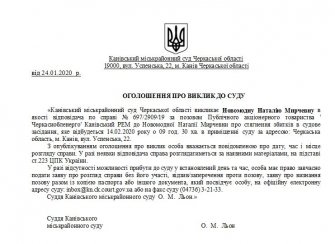 Канівський міськрайонний суд Черкаської області викликає Новомодну Наталію Мирчевну в якості відповідача по справі № 697/2909/19 за позовом Публічного акціонерного товариства ' Черкасиобленерго' Канівський РЕМ до Новомодної Наталії Мирчевни про стягнення збитків в судове засідання, яке відбудеться 14.02.2020 року о 09 год. 30 хв. в приміщенні суду за адресою: Черкаська область, м. Канів, вул. Успенська, 22.
