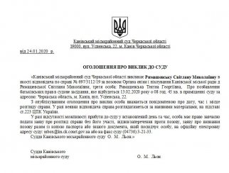 Канівський міськрайонний суд Черкаської області викликає Римашевську Світлану Миколаївну в якості відповідача по справі № 697/3112/19 за позовом Органа опіки і піклування Канівської міської ради до Римашевської Світлани Миколаївни, третя особа: Римашевська Теятна Георгіївна, Про позбавлення батьківських прав в судове засідання, яке відбудеться 13.02.2020 року о 08 год. 45 хв. в приміщенні суду за адресою: Черкаська область, м. Канів, вул. Успенська, 22.