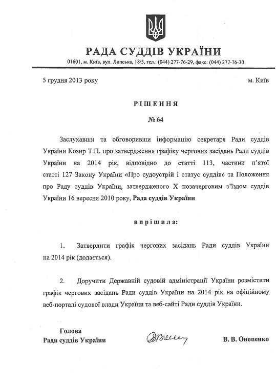 Радою суддів України затверджено графік чергових засідань Ради суддів України на 2014 рік