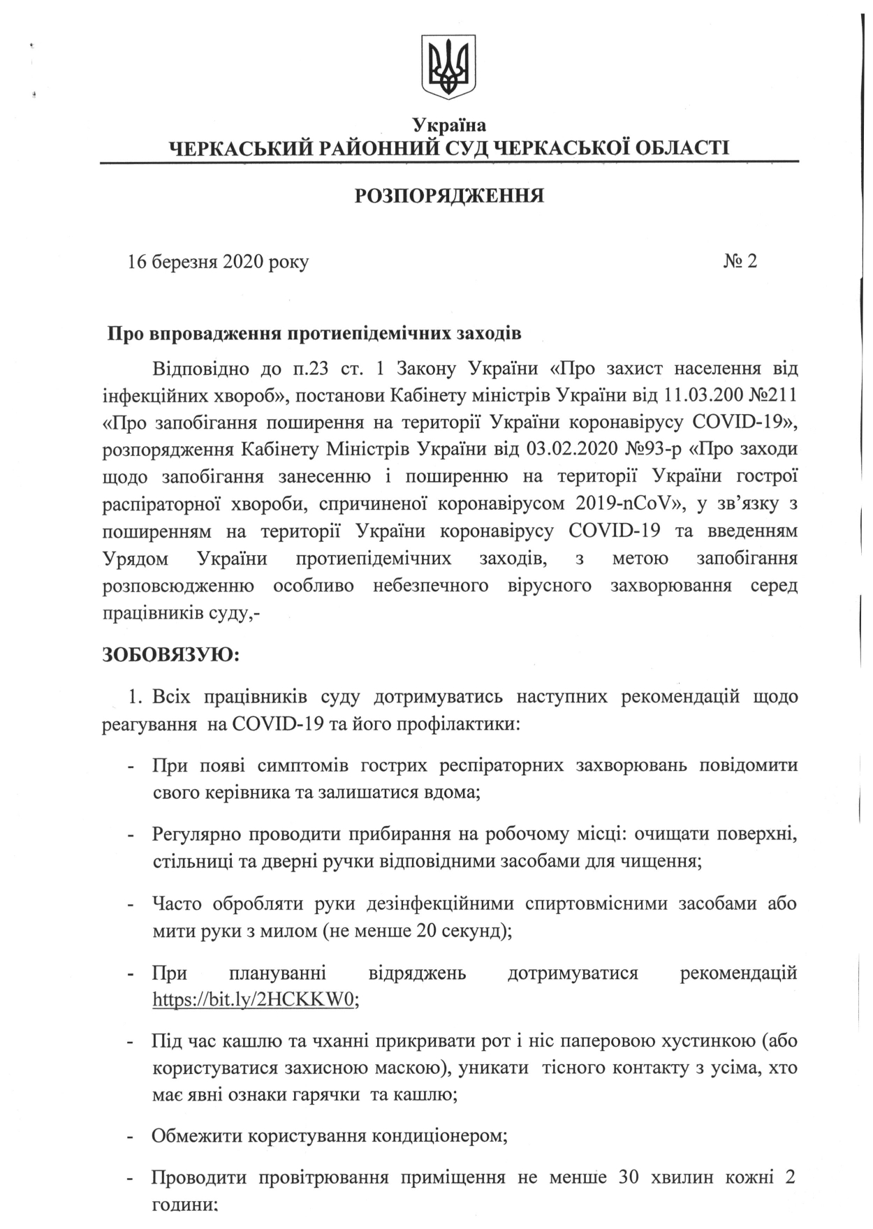 Керуючись метою убезпечити відвідувачів Черкаського районного суду Черкаської області від розповсюдження гострої респіраторної хвороби та масового поширення вірусної інфекції, звертаємося до громадян з проханням утриматися від участі у судових засіданнях, якщо слухання не передбачають Вашої обов'язкової присутності, а також від особистого відвідування суду для подачі позовів, заяв, скарг, клопотань та інших звернень.