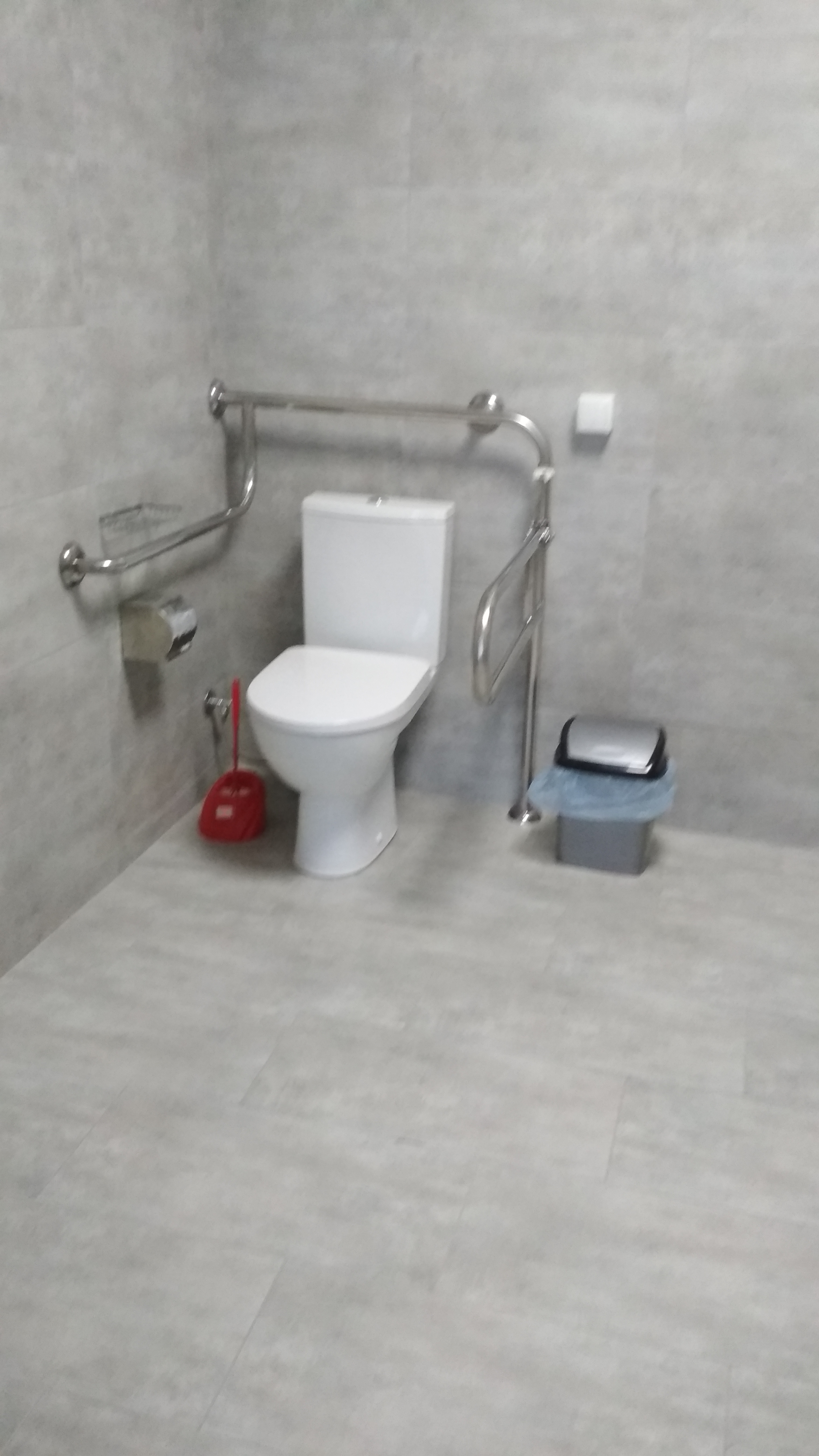 Кабіна туалету облаштована допоміжними засобами: поручнями та кнопкою виклику.