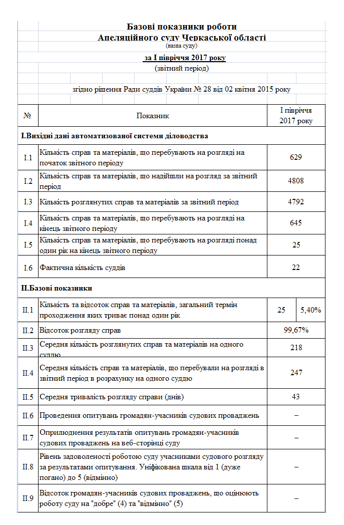 Базові показники ефективності діяльності апеляційного суду Черкаської області за перше півріччя 2017 року