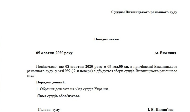 Оголошення про збори суддів Вижницького районного суду Чернівецької області