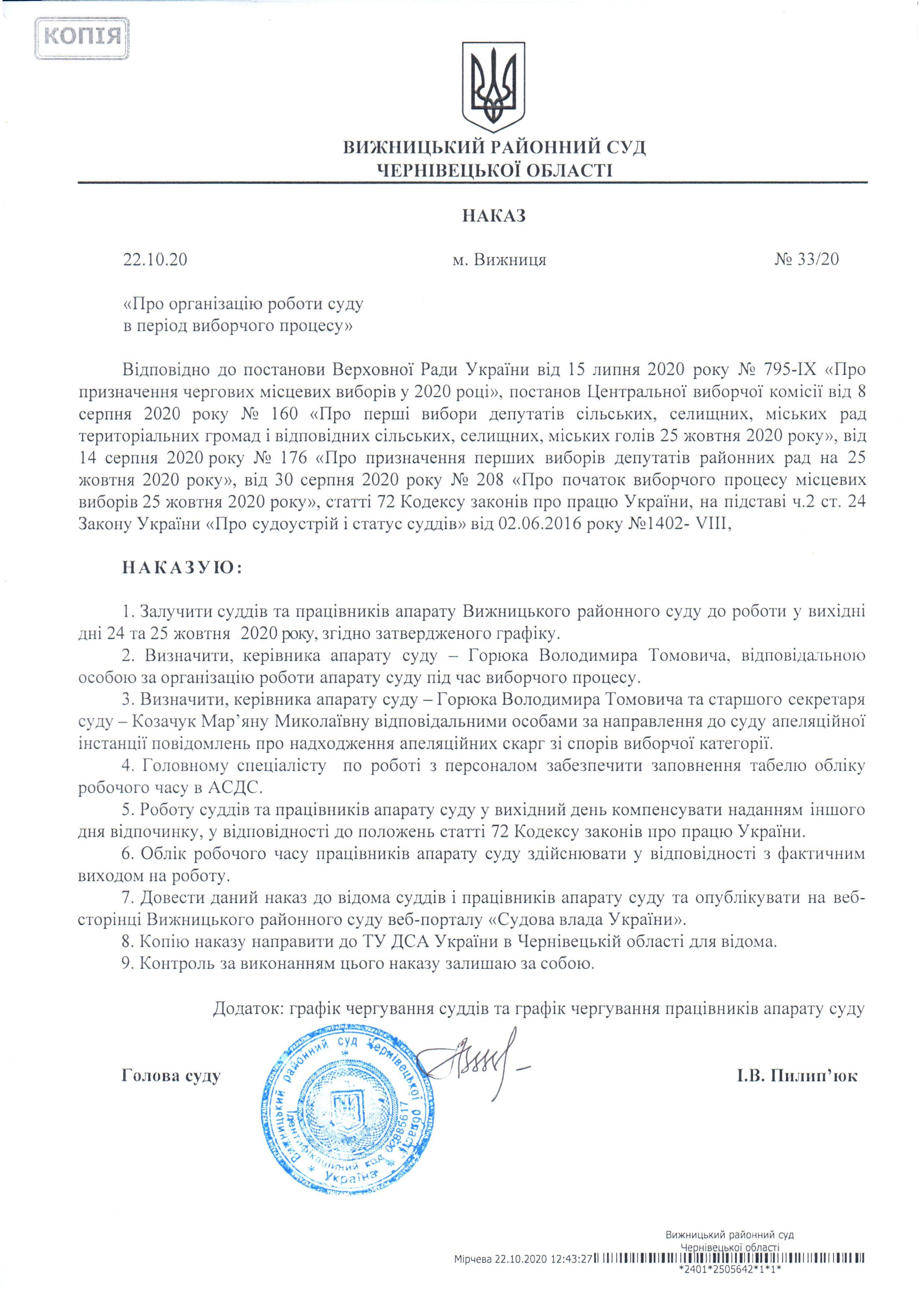 Про організацію роботи Вижницького районного суду в період виборчого процесу