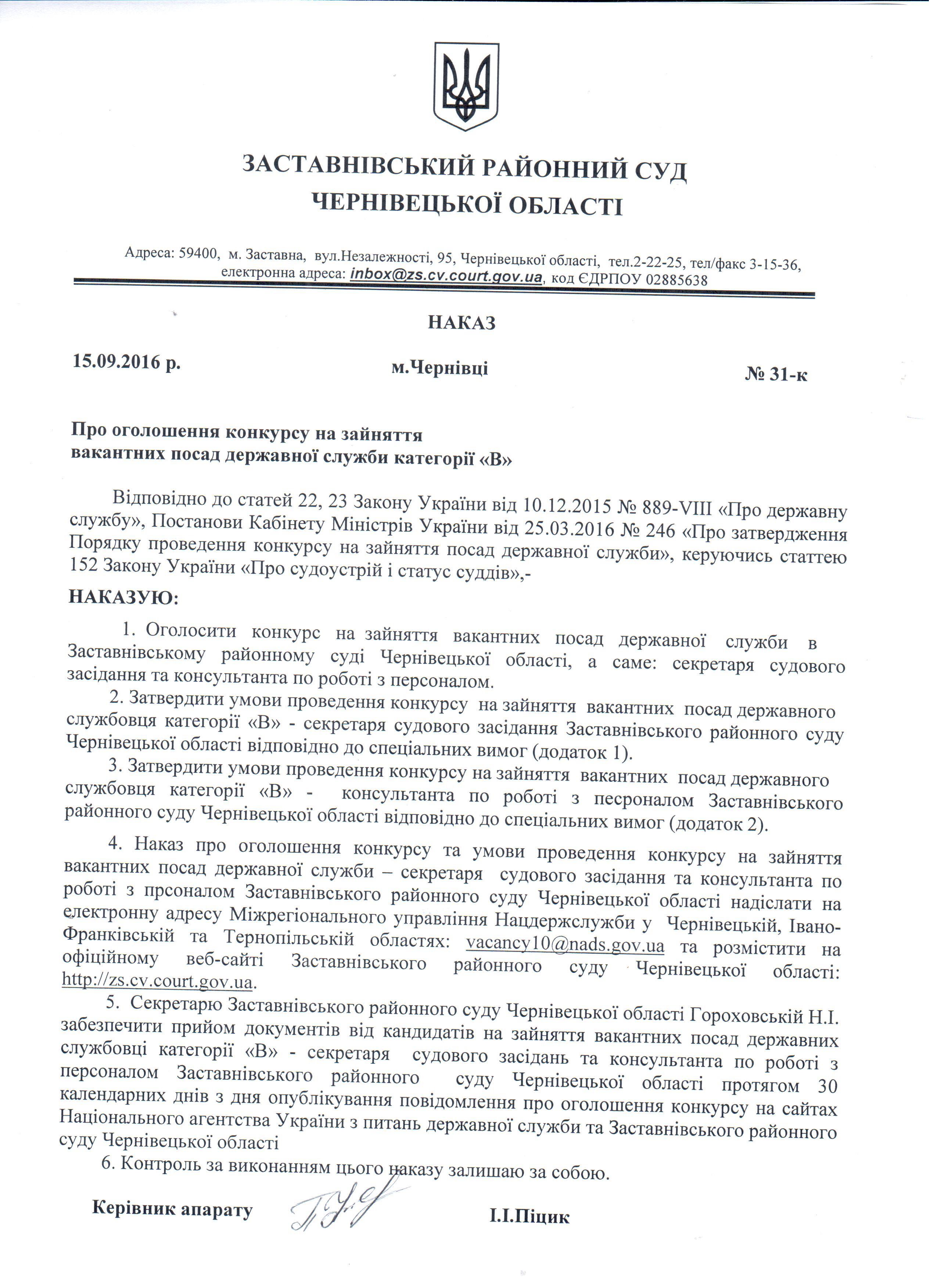Наказ Про оголошення конкурсу на зайняття вакантних посад державної служби категорії "В"