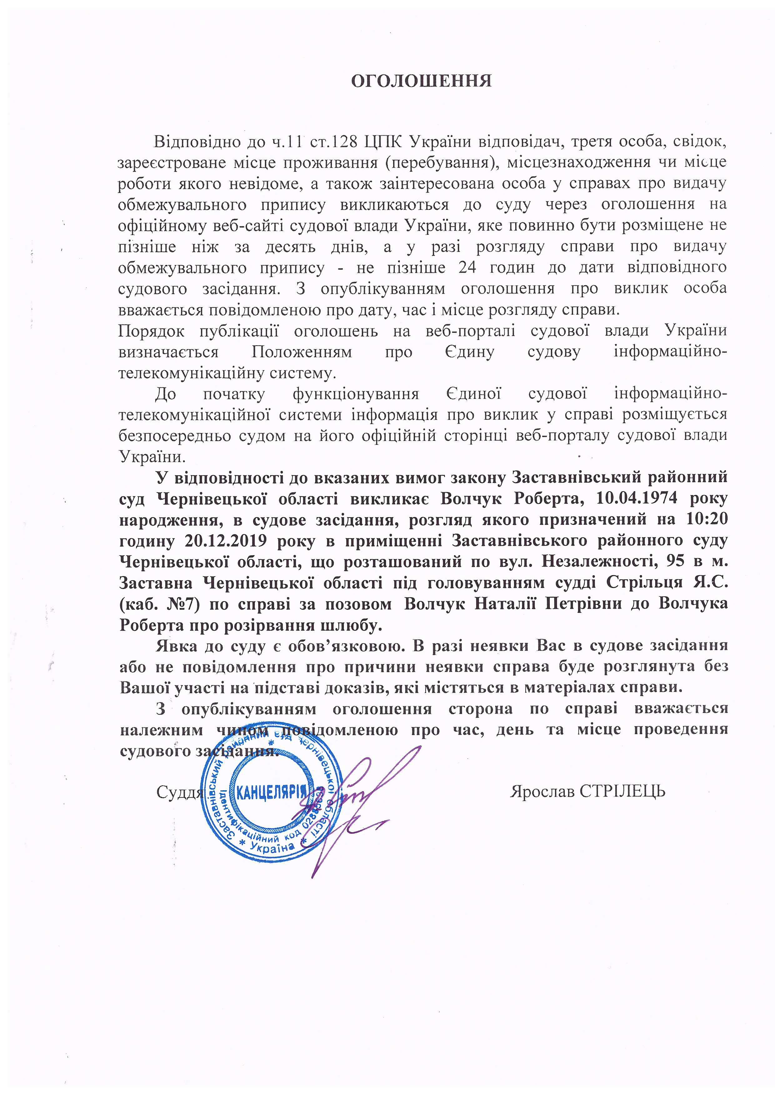 Оголошення про виклик до суду Волчук Роберта