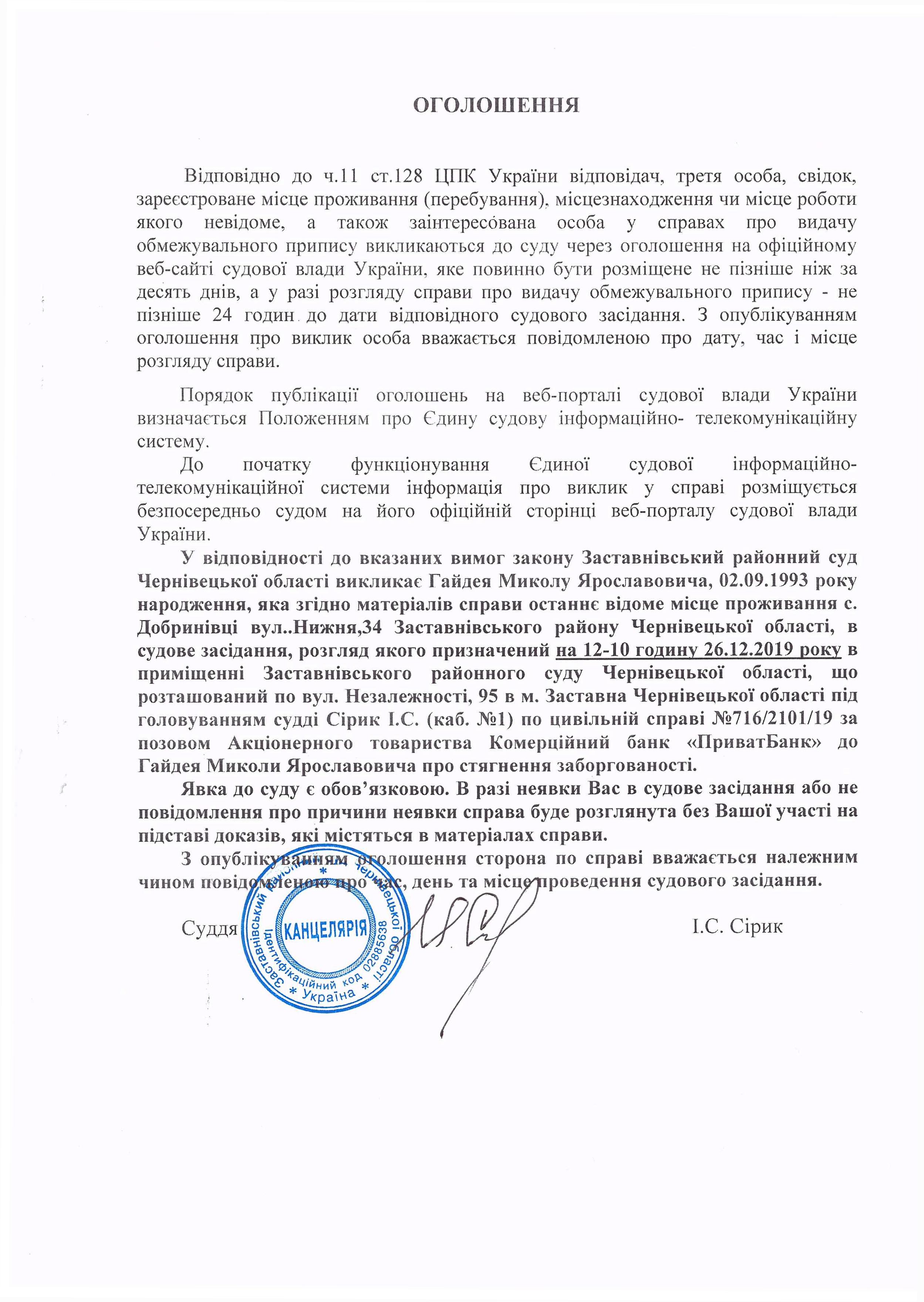 Оголошення про виклик до суду Гайдея Миколи Ярославовича