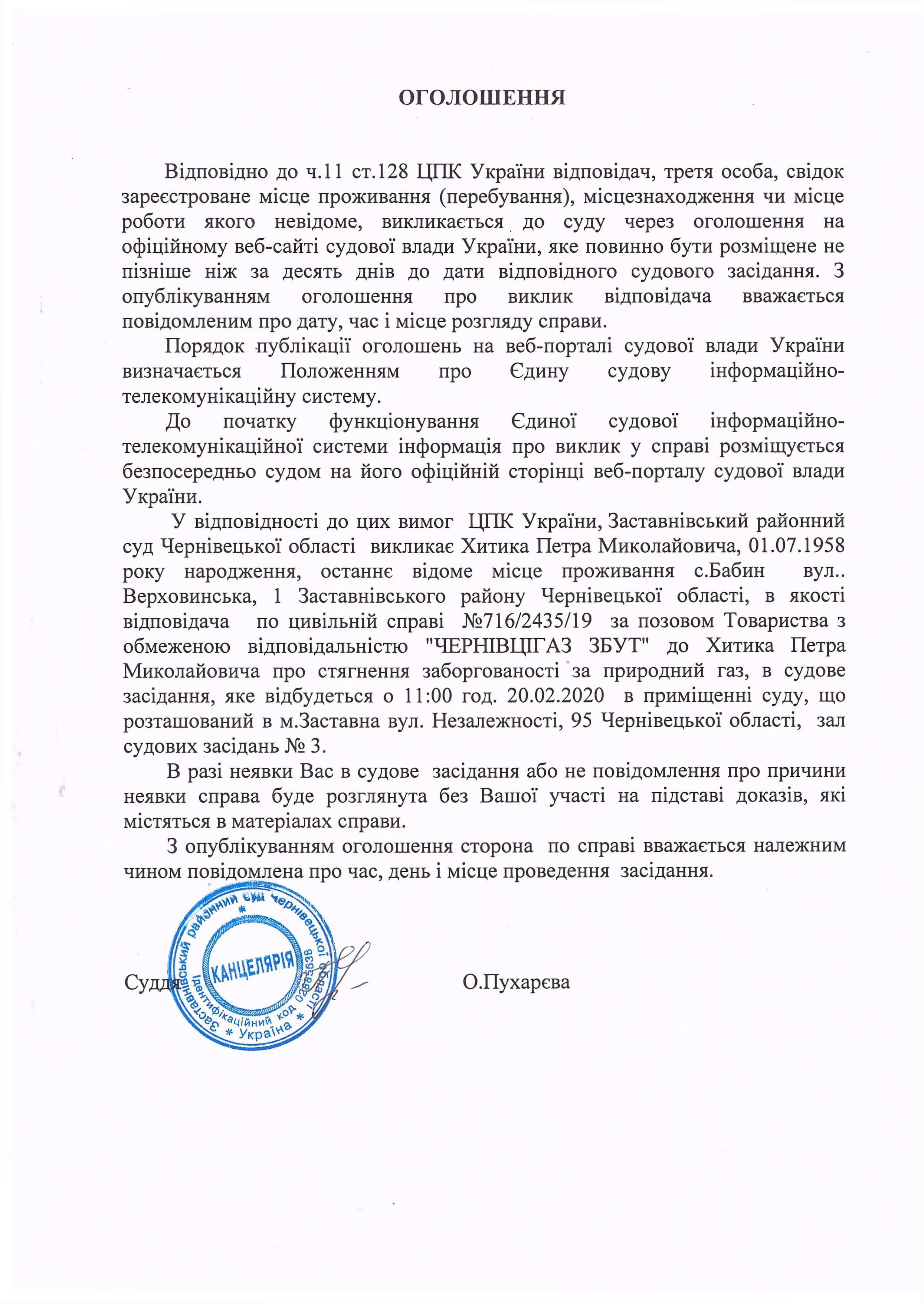 Оголошення про виклик до суду Хитика Петра Миколайовича