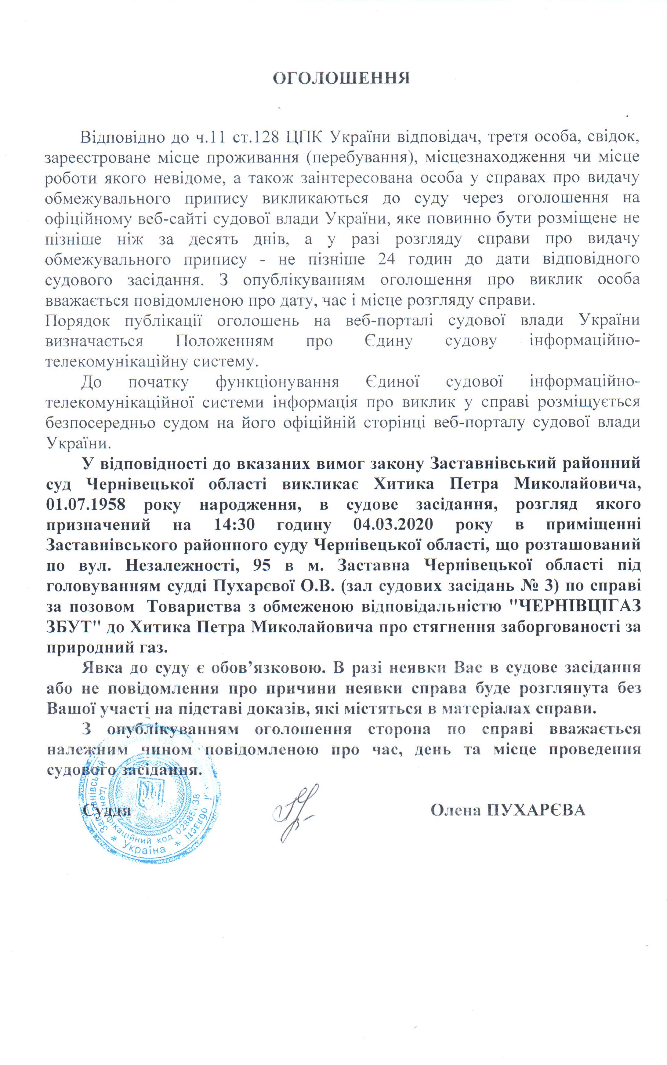 Оголошення про виклик до суду Хитика Петра Миколайовича
