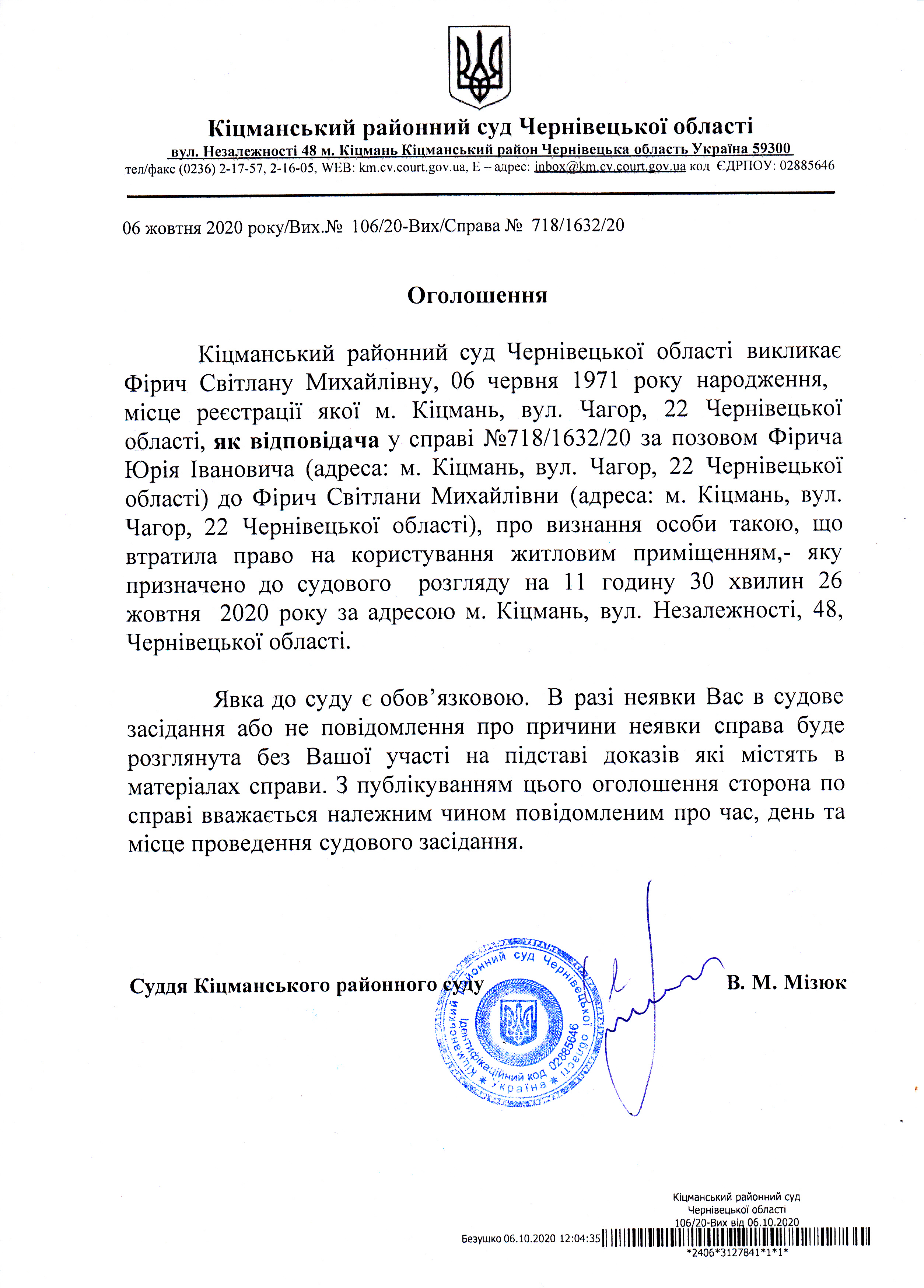 Оголошення про виклик до суду Фірич Світлану Михайлівну по справі 718/1632/20