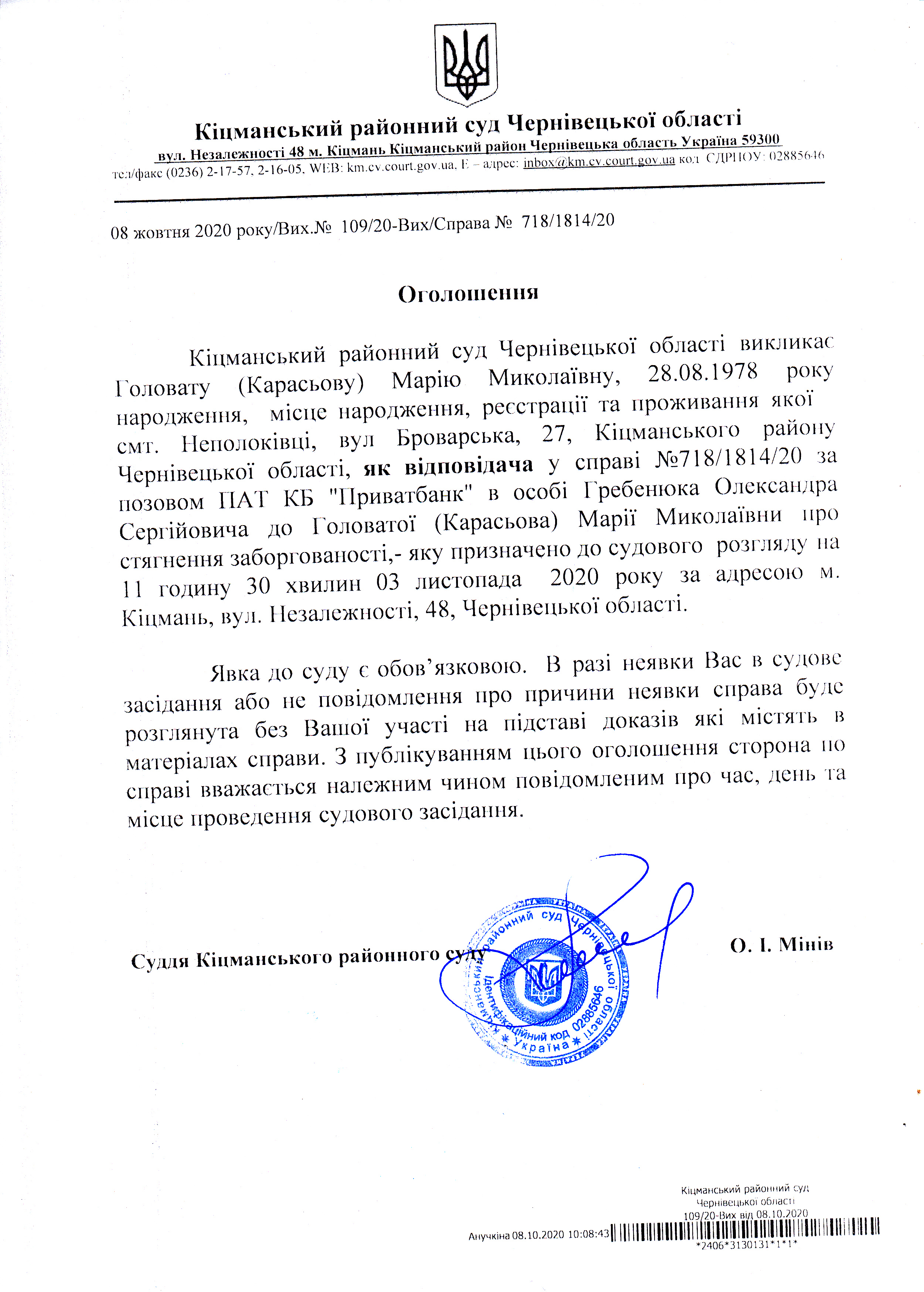 Оголошення про виклик до суду Головату(Карасьову) Марію Миколаївну по справі 718/1814/20