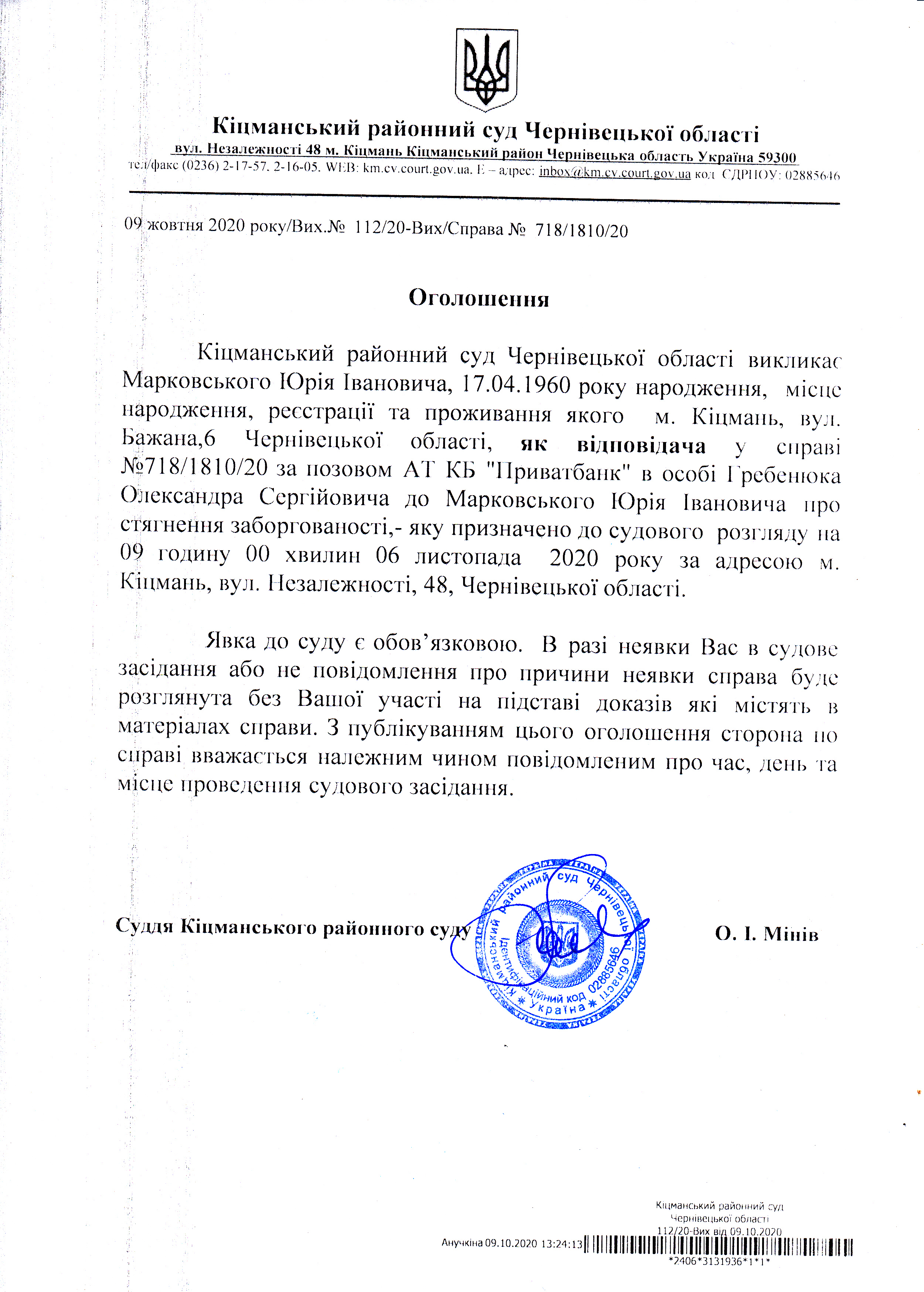 Оголошення про виклик до суду Марковського Юрія Івановича по справі 718/1810/20