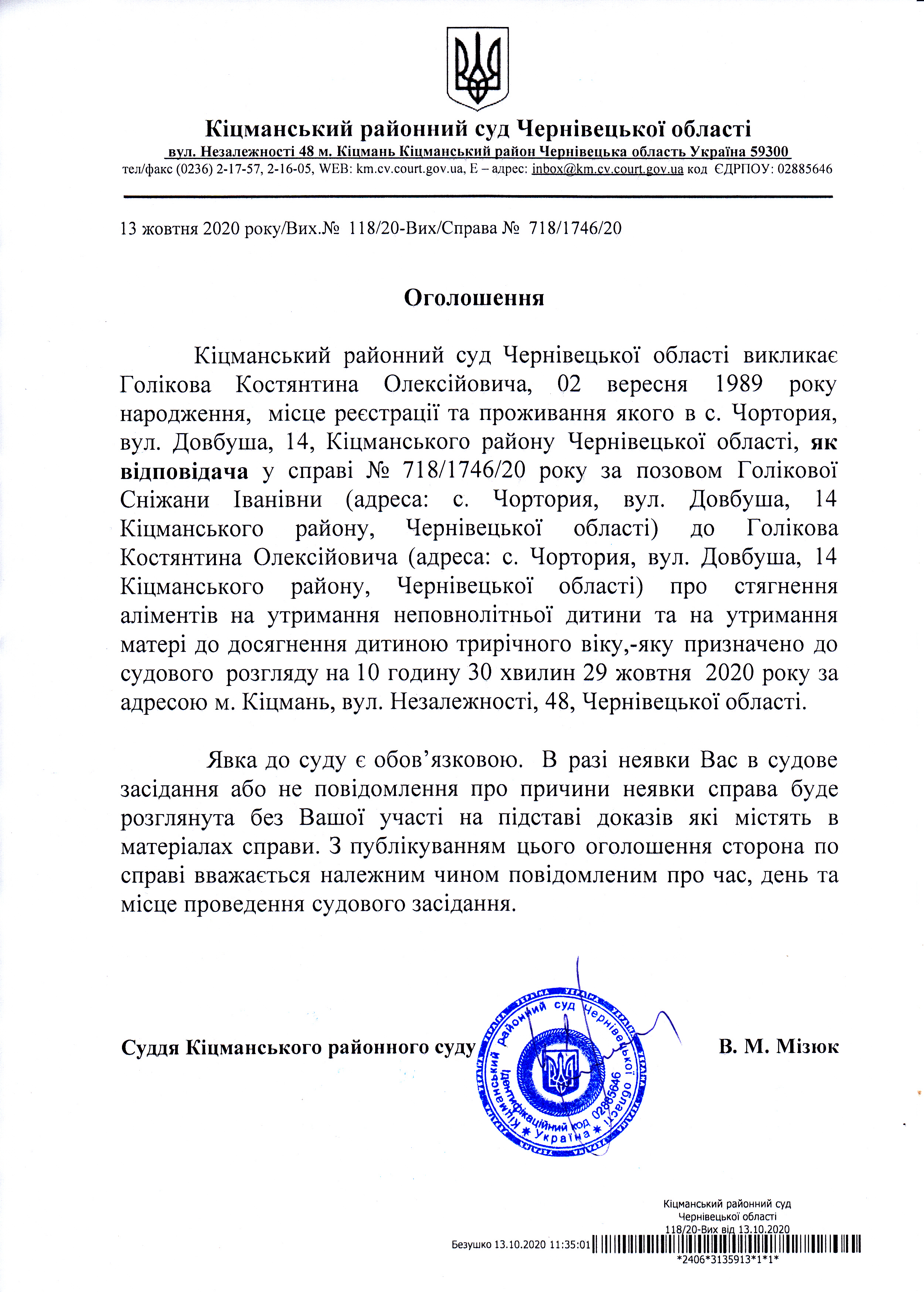Оголошення про виклик до суду Голікова Костянтина Олексійовича по справі 718/1746/20