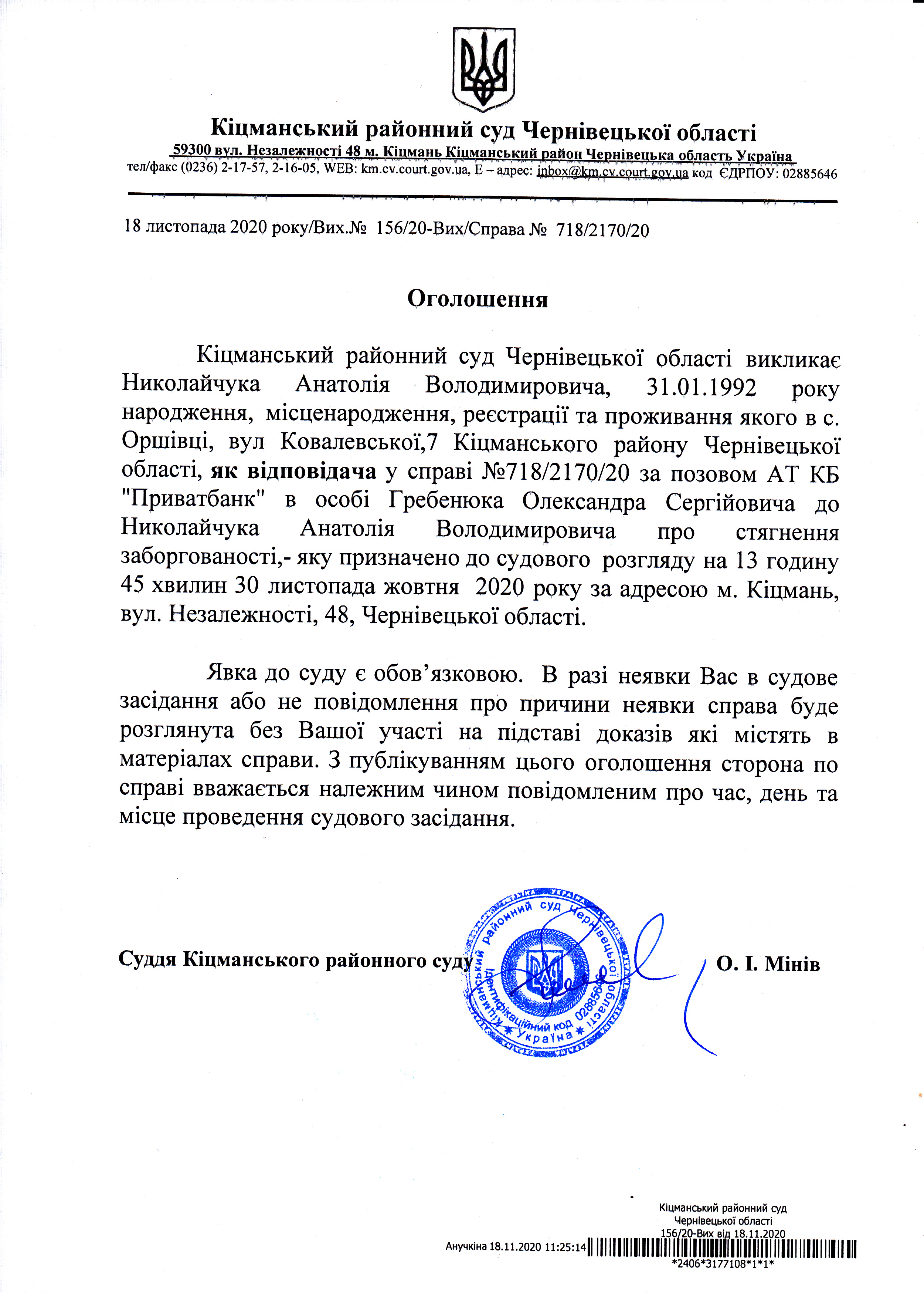 Оголошення про виклик до суду Николайчука Анатолія Володимировича по справі 718/2170/20