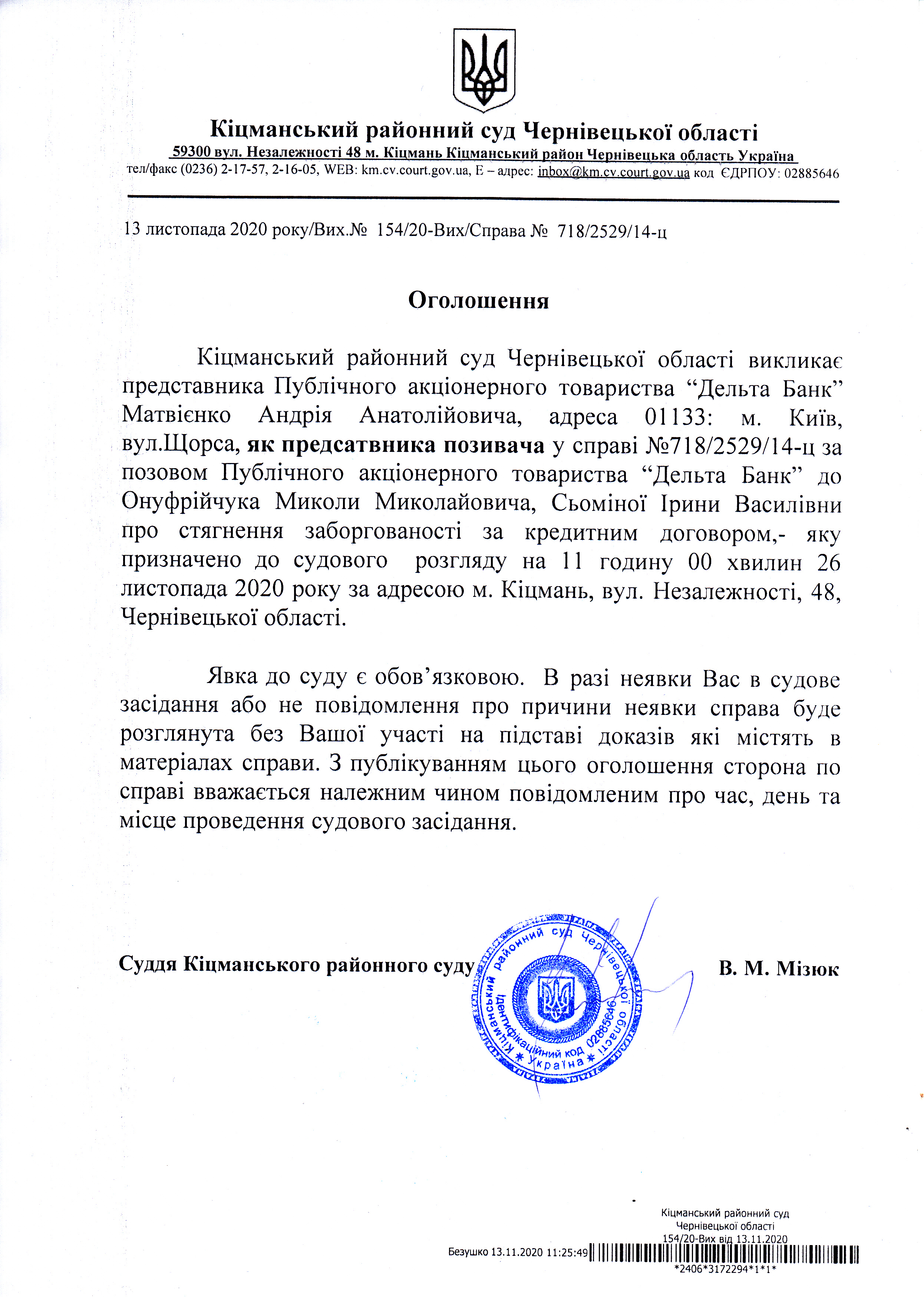 Оголошення про виклик до суду Представника Публічного акціонерного товариства "Дельта банк" Матвієнко Андрія Анатолійовича по справі 718/2529/14-ц