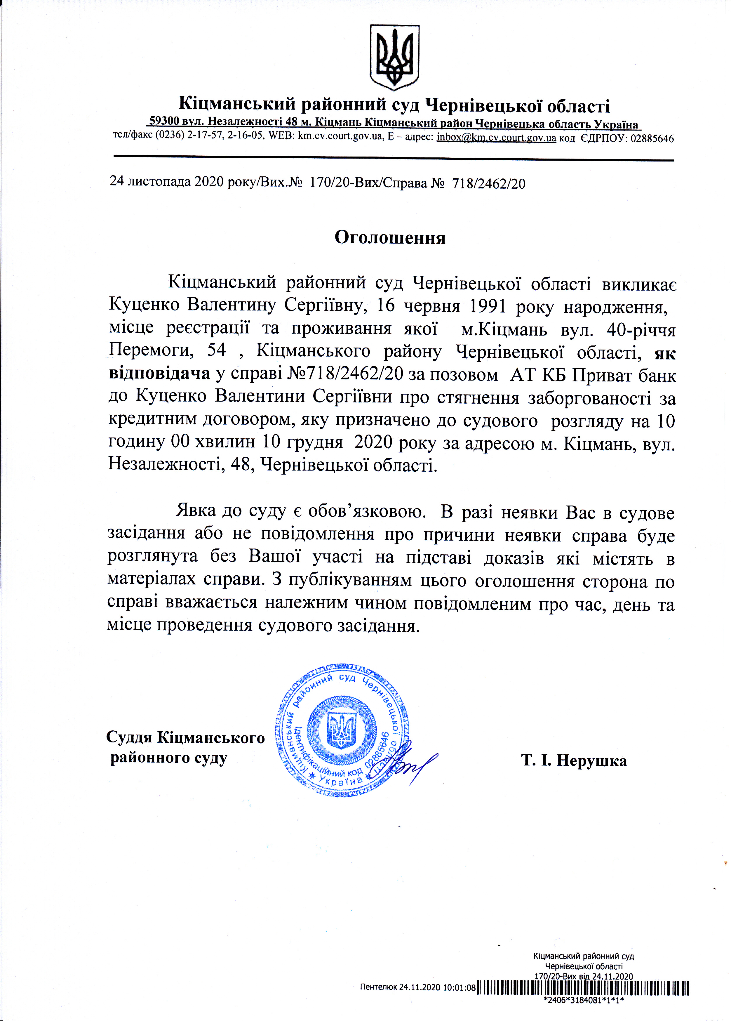 Оголошення про виклик до суду Куценко Валентину Сергіївну по справі 718/2462/20