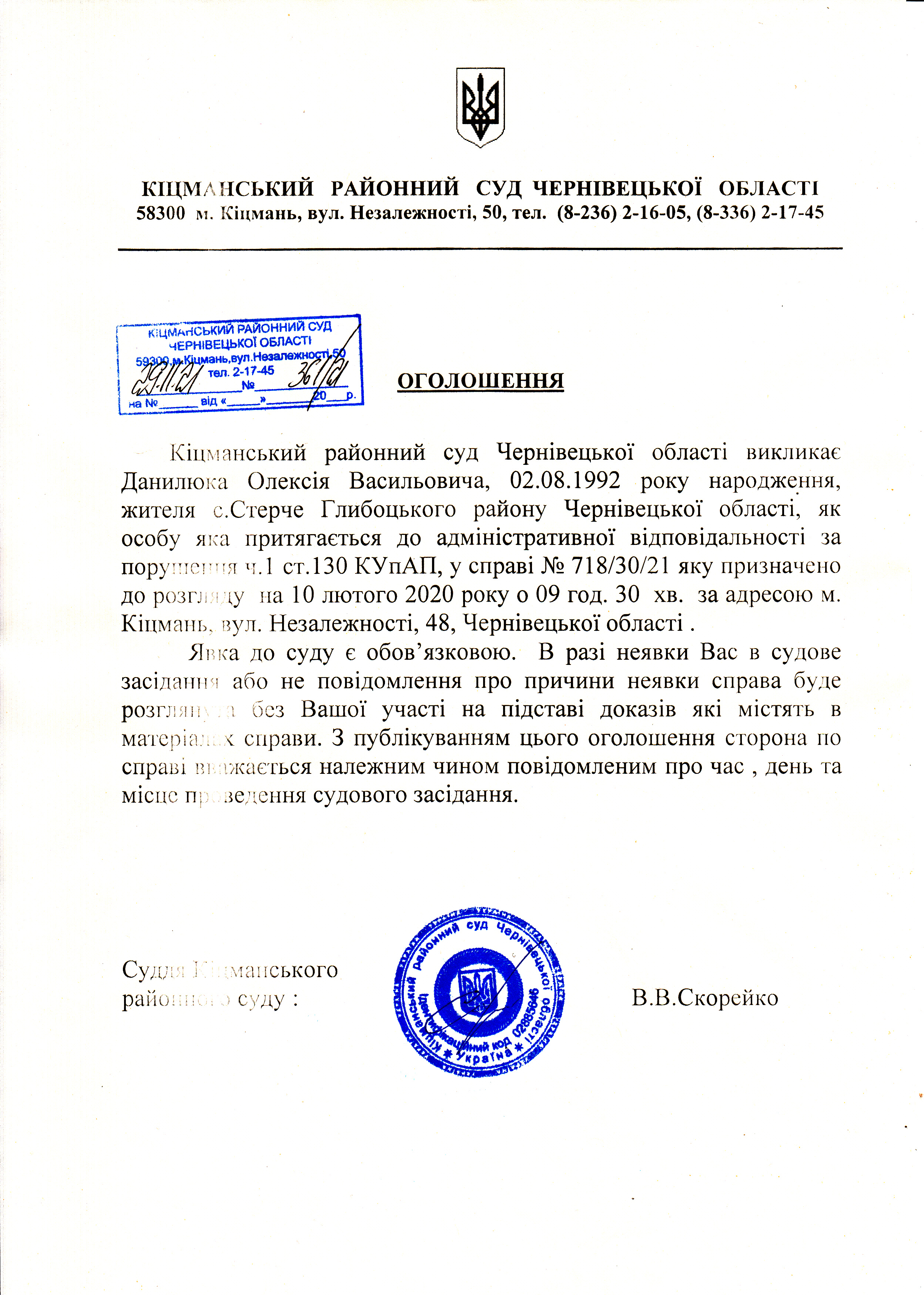 Оголошення про виклик до суду Данилюка Олексія Васильовича по справі 718/30/21