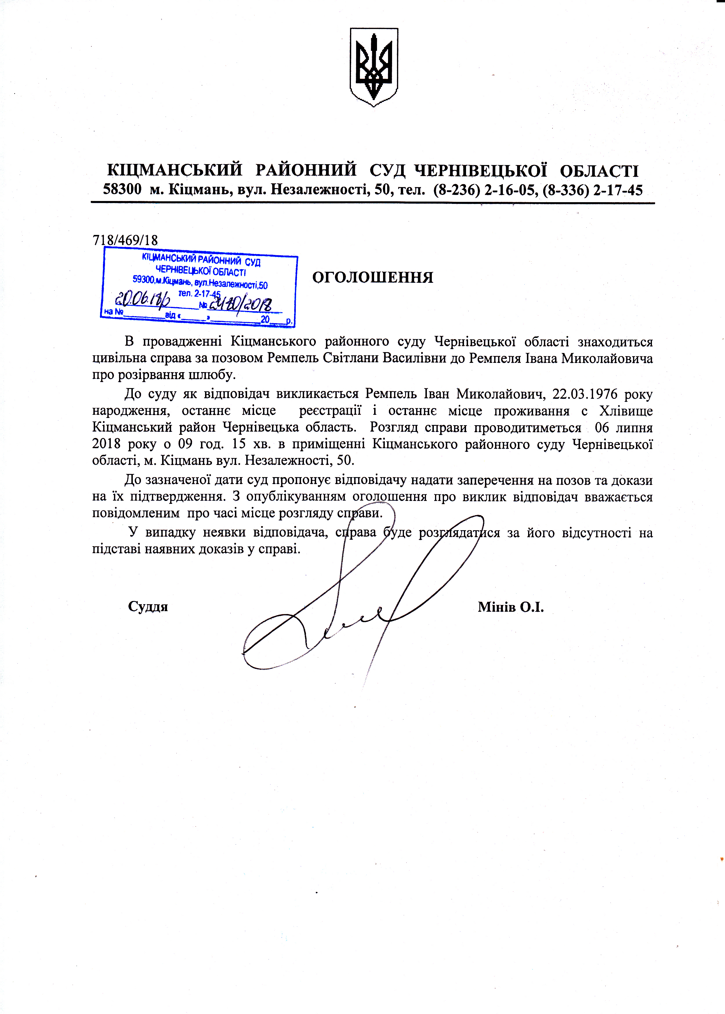 Оголошення про виклик до суду Ремпель Світлани Василівни по справі 718/469/18