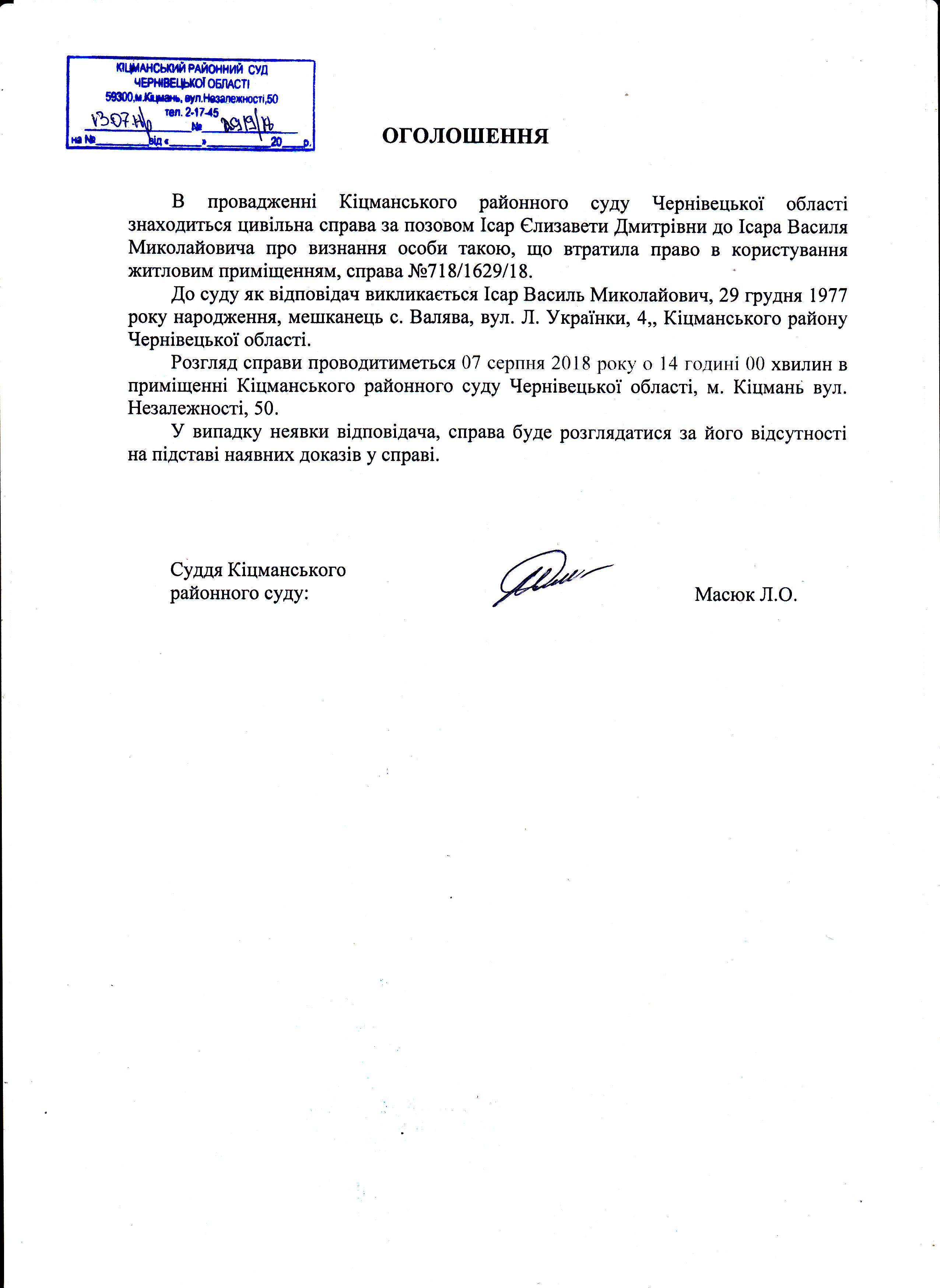 Оголошення про виклик до суду Ісар Василь Миколайович по справі 718/1629/18