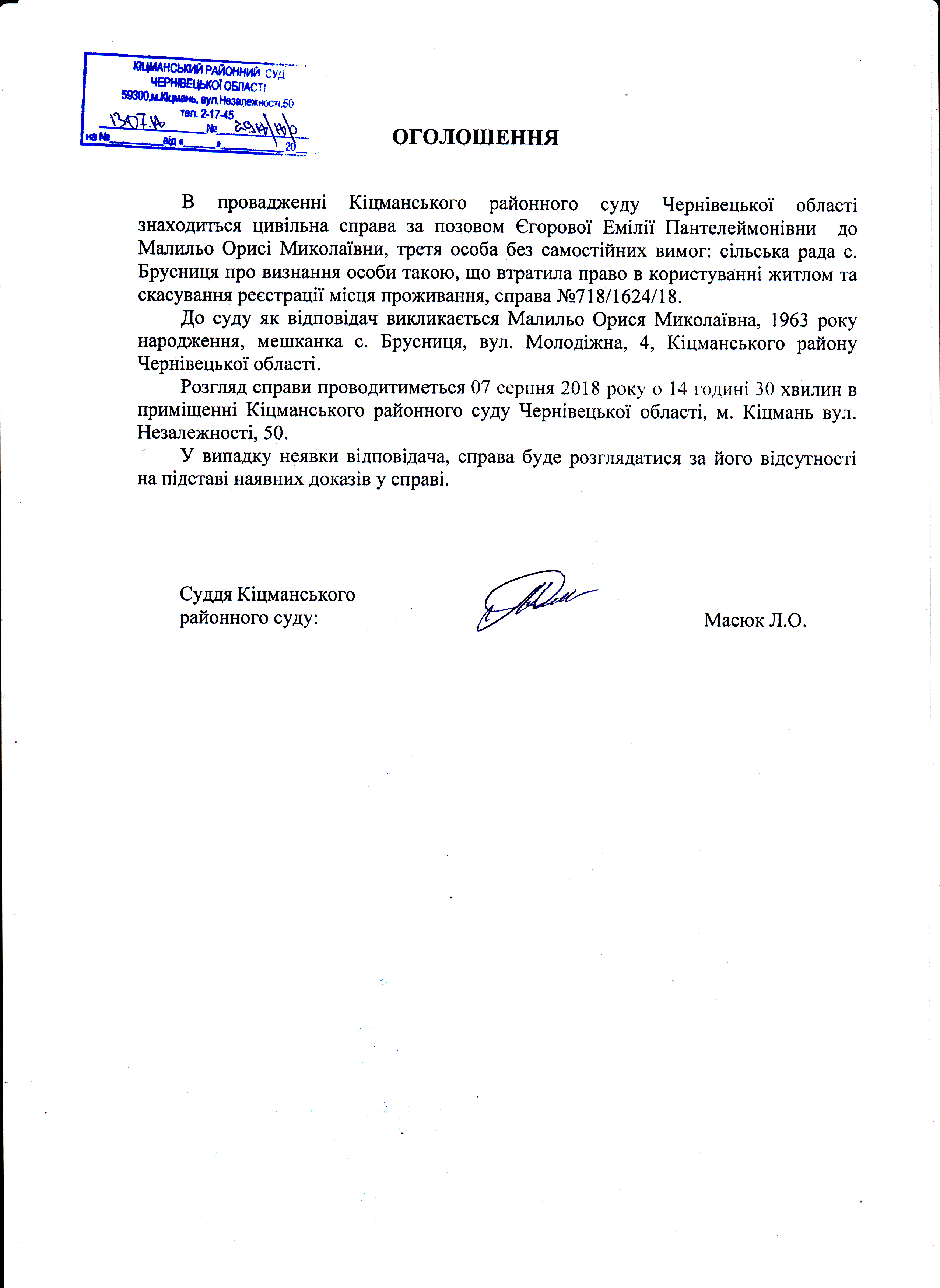Оголошення про виклик до суду Малильо Орися Миколаївна по справі 718/1624/18