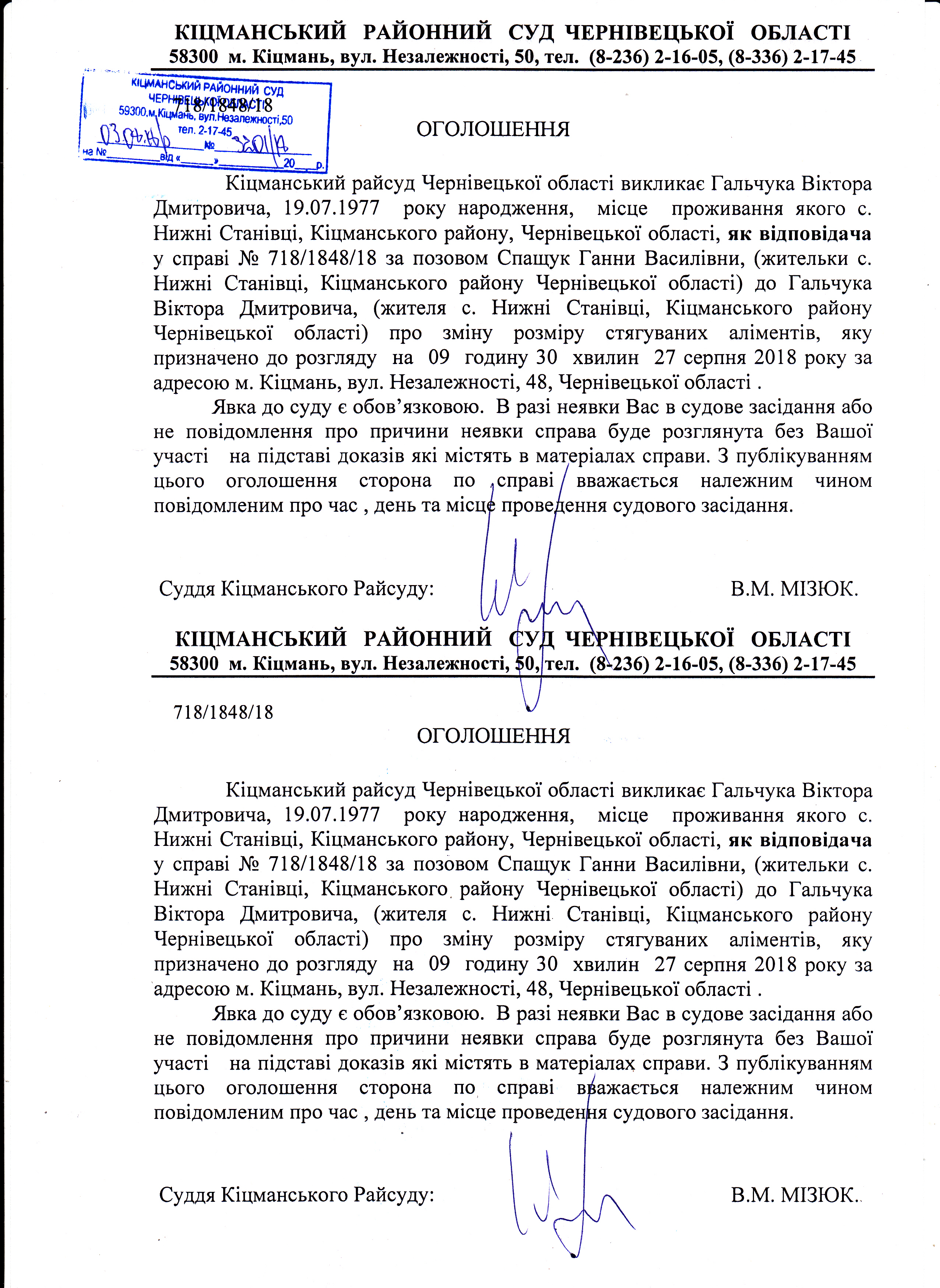 Оголошення про виклик Гальчука Віктора Дмитровича до суду по справі 718/1848/18