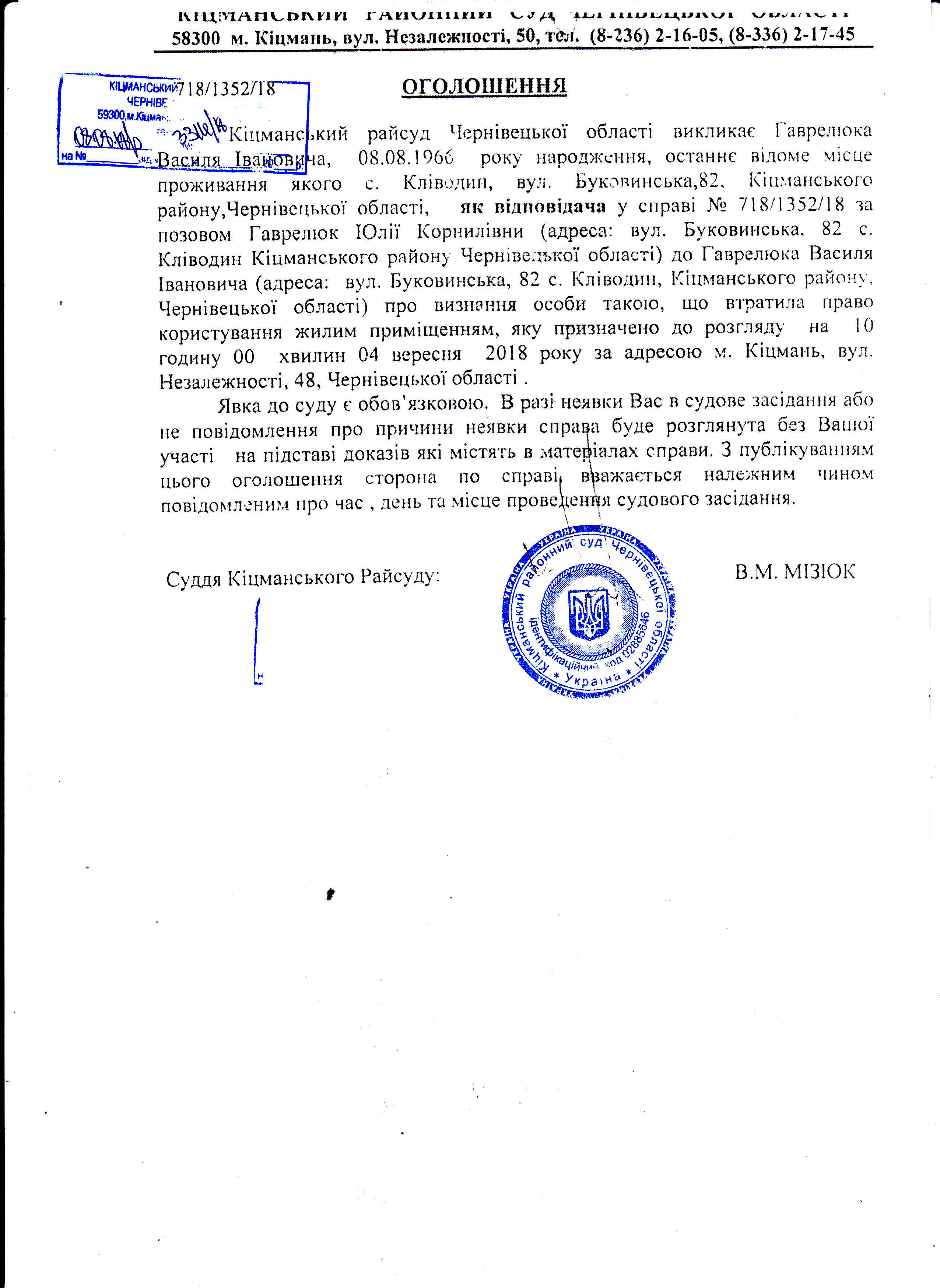 Оголошення про виклик Гаврелюка Василя Івановича до суду по справі 718/1352/18