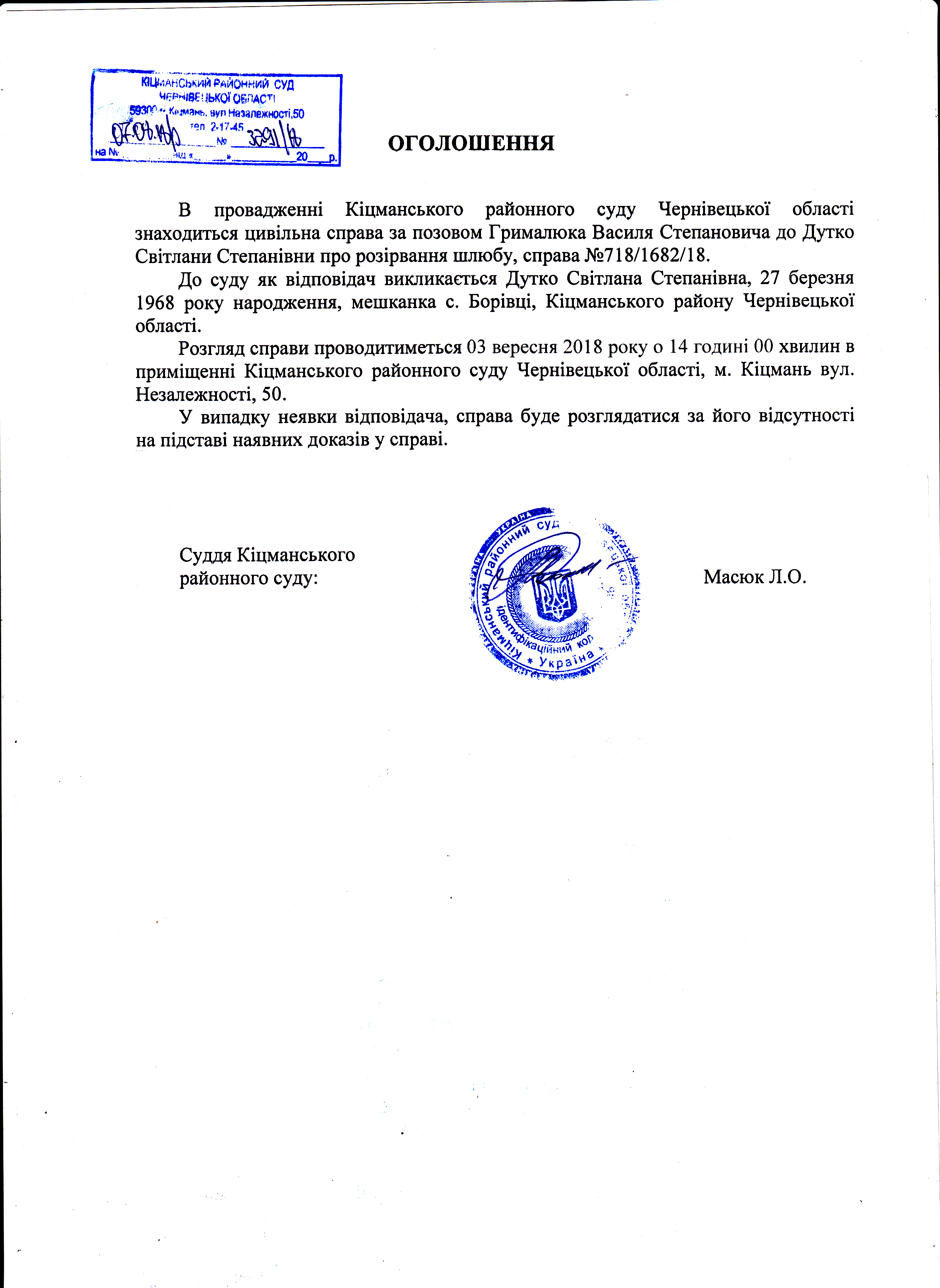 Оголошення про виклик Дудко Світлана Степанівна до суду по справі 718/1682/18