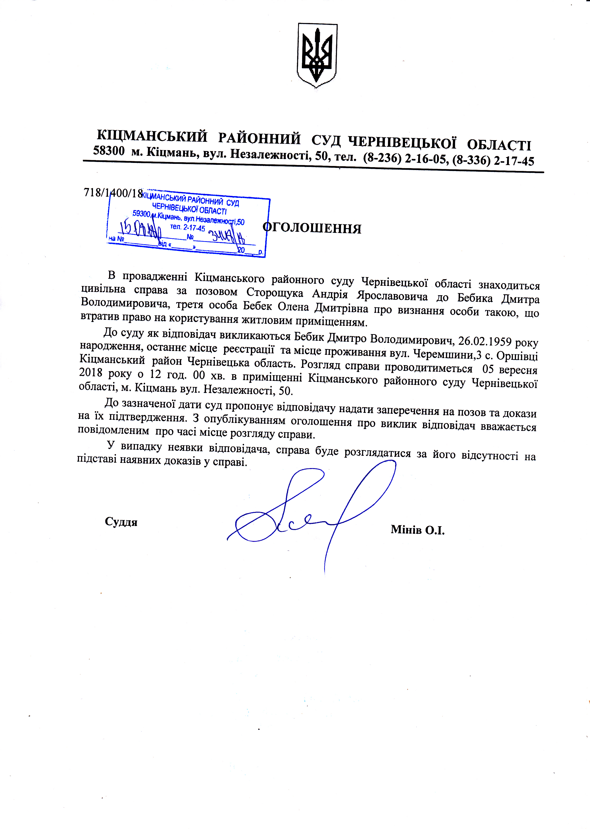 Оголошення про виклик до суду Бебика Дмитра Володимировича по справі 718/1400/18