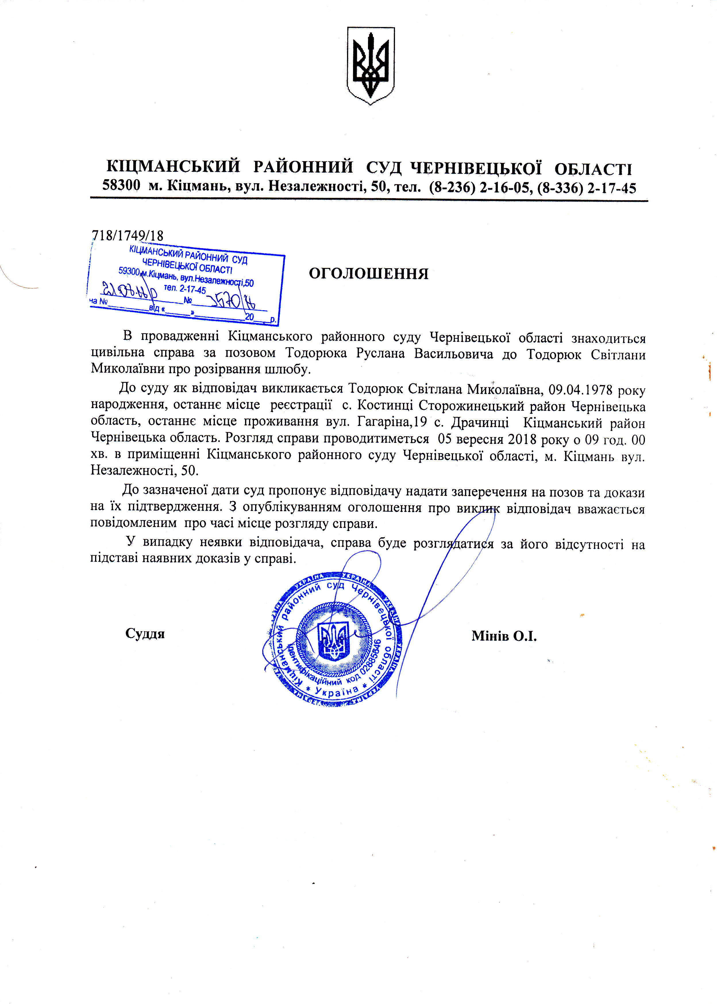 Оголошення про виклик до суду Тодорюк Світлана Миколаївна по справі 718/1749/18