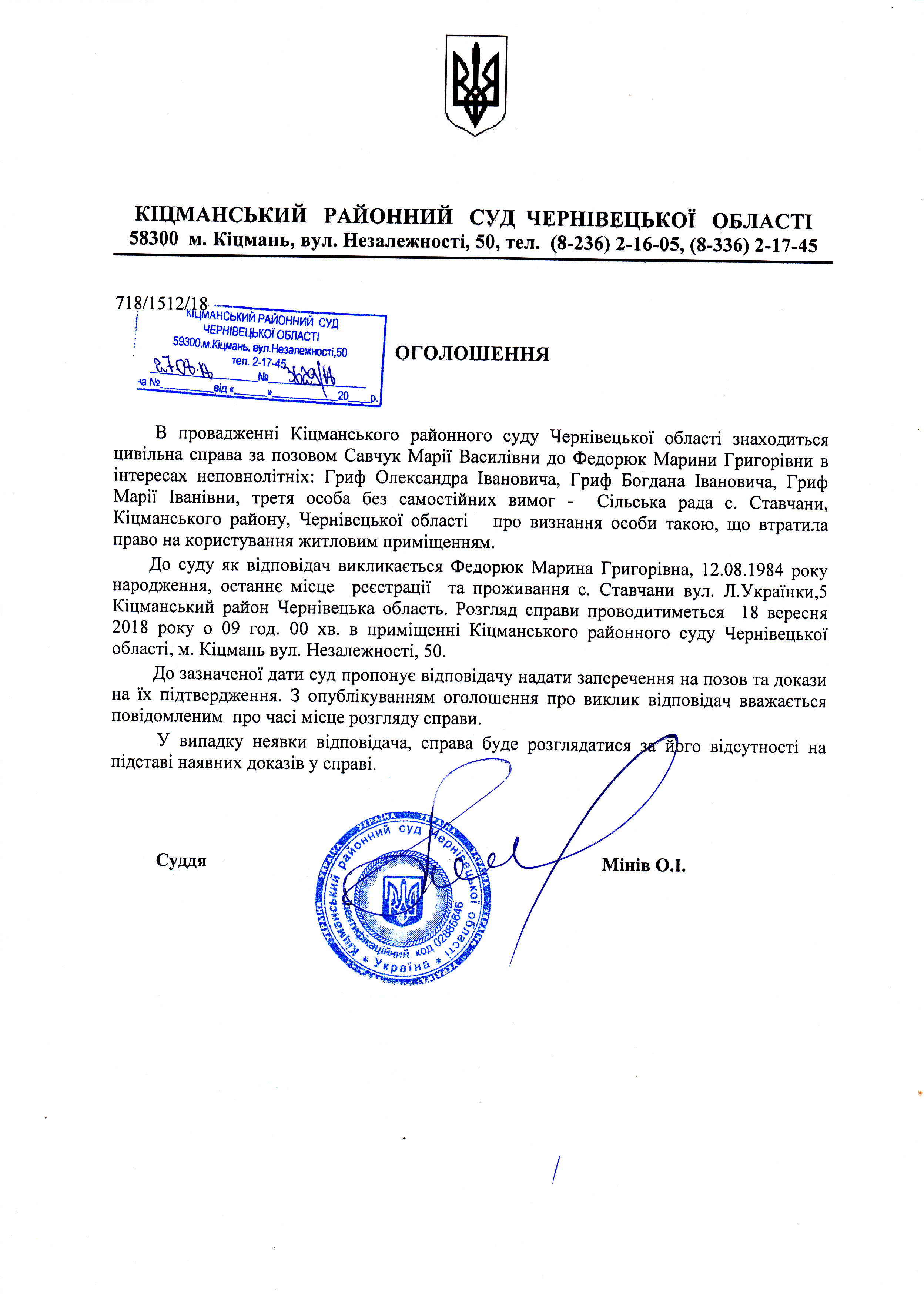 Оголошення про виклик до суду Федорюк Марина Григорівна по справі 718/1512/18