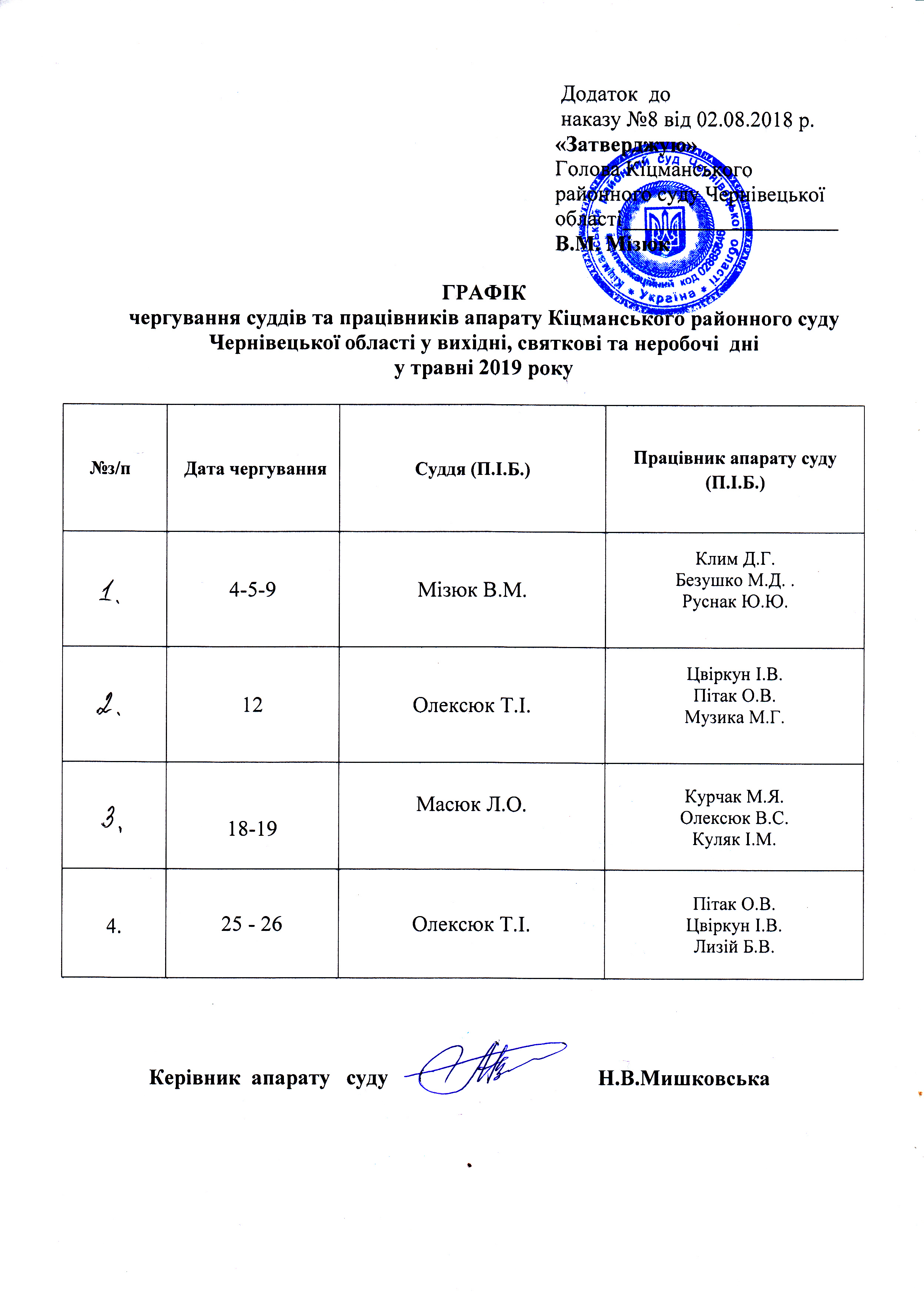 Графік чергування суддів та працівників апарату Кіцманського районного суду у травні 2019 року