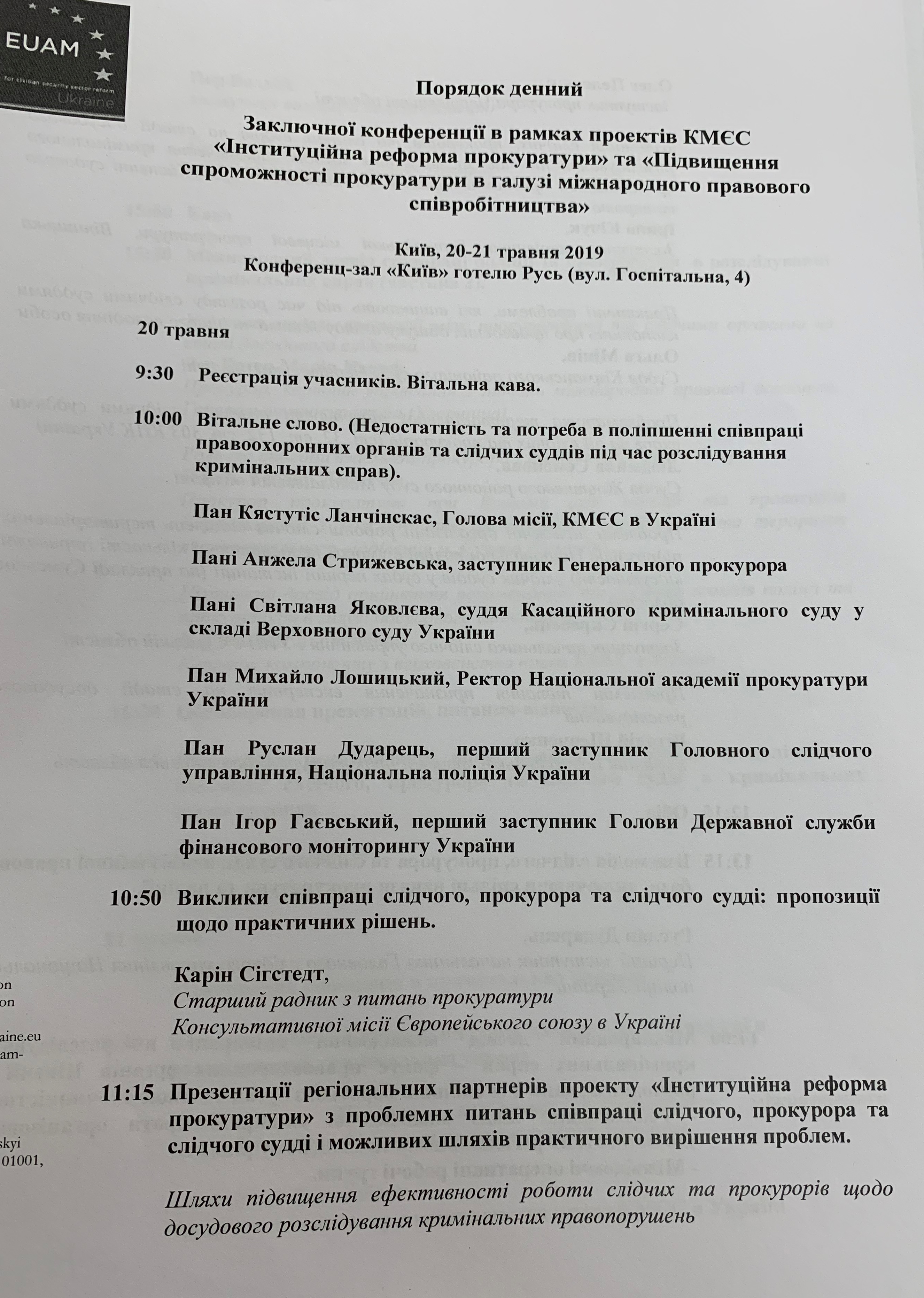 На конференції, організованій в Києві 20-21 травня 2019 року Консультативною місією ЄС в Україні (КМЄС), вивчали, як покращити в Україні співпрацю між співробітниками поліції, прокуратури та судів, як на державному, так і міжнародному рівні, для розслідування та судового переслідування злочинів.