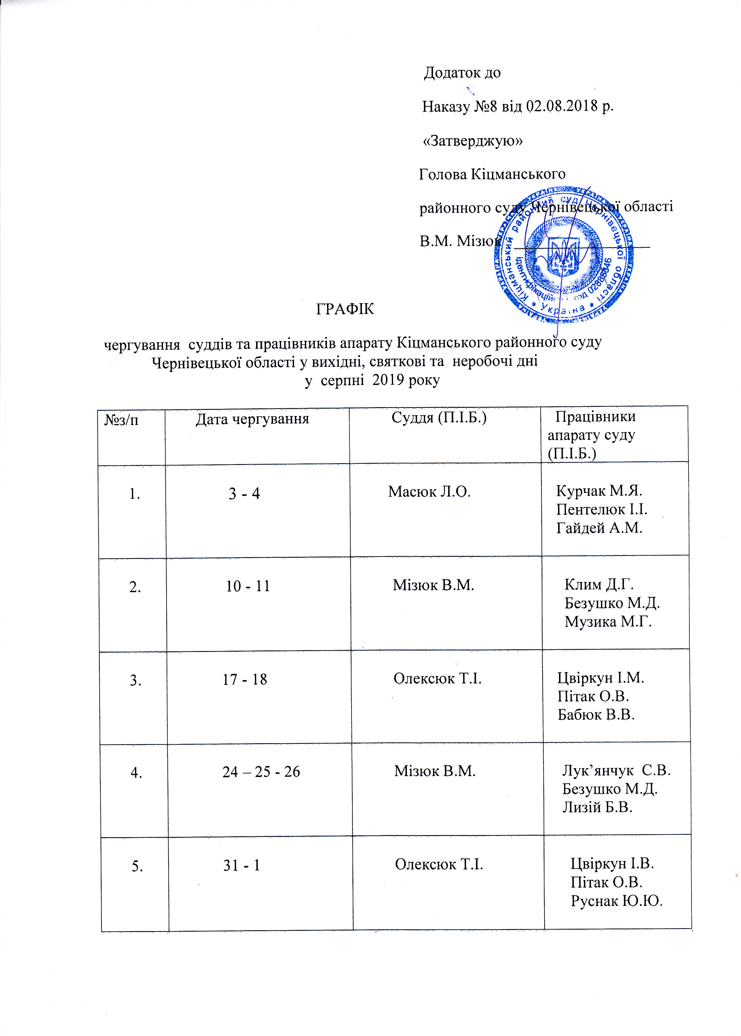 Графік чергування суддів та працівників апарату Кіцманського районного суду у серпні 2019 року