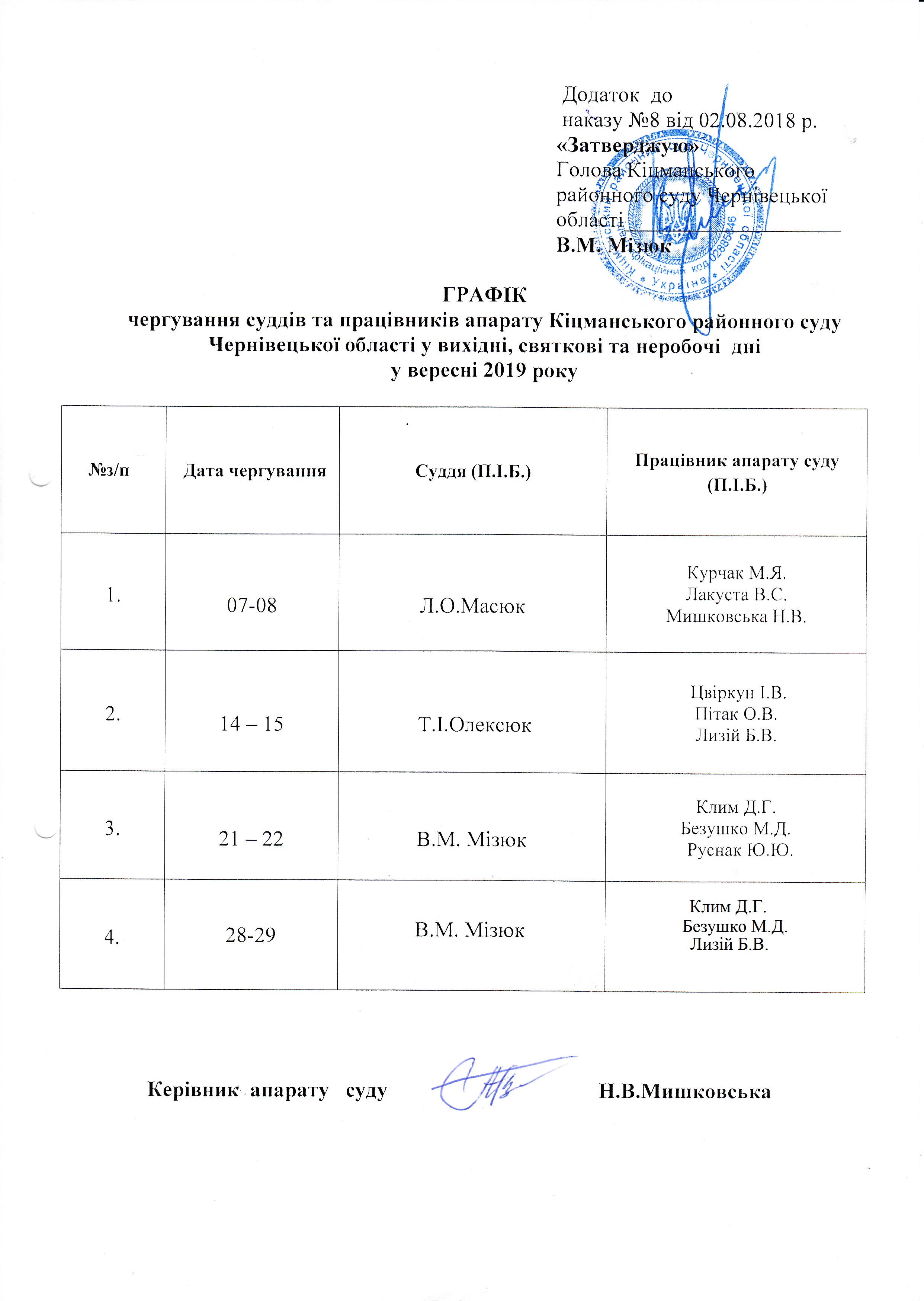 Графік чергування суддів та працівників апарату Кіцманського районного суду у вересні 2019 року