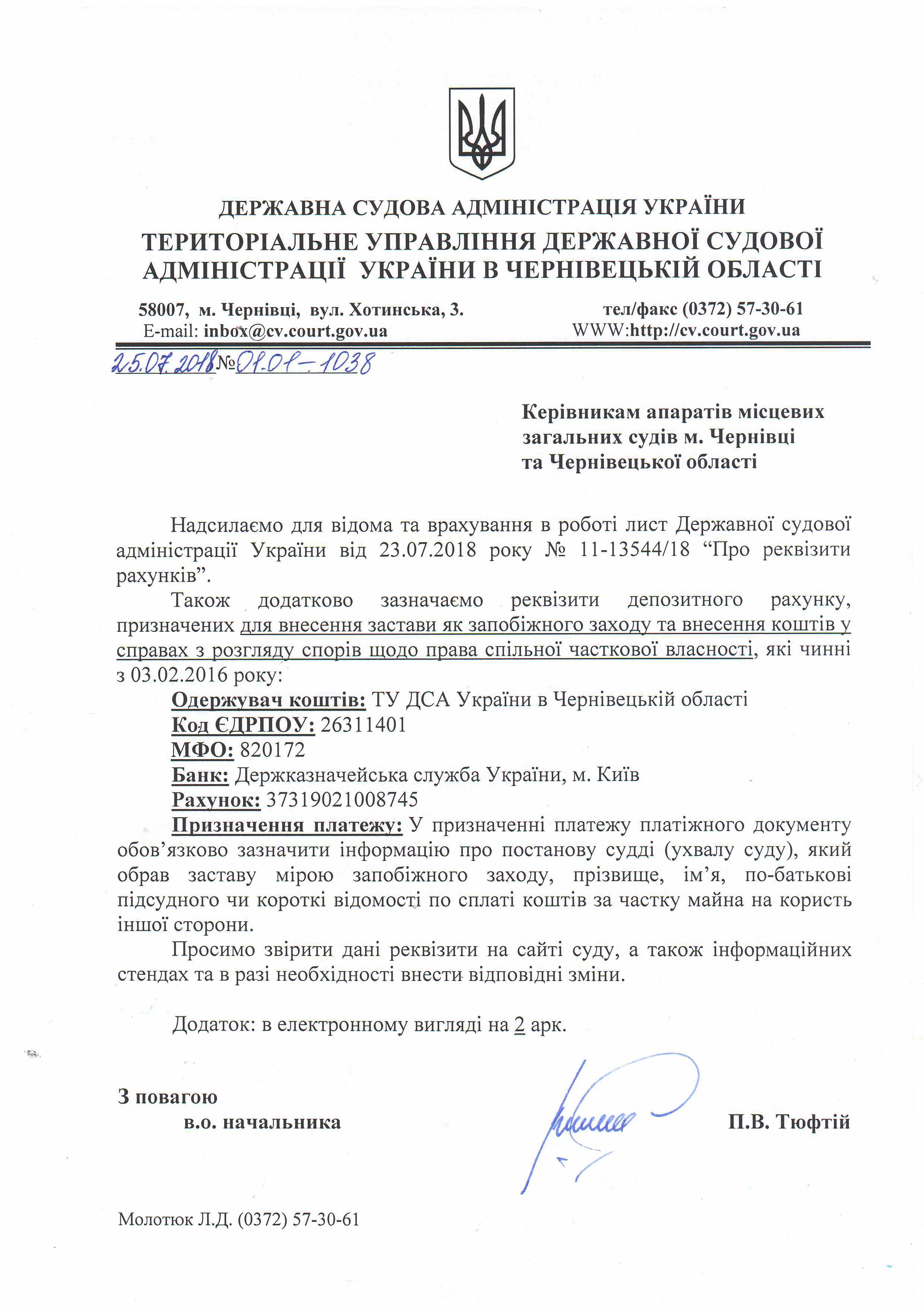 Змінено платіжні реквізити ТУ ДСА України у Чернівецькій області для перерахування коштів на спеціальний рахунок у разі застосування застави як запобіжного заходу та для внесення грошової суми згідно ст.362*, ст.365** Цивільного кодексу України