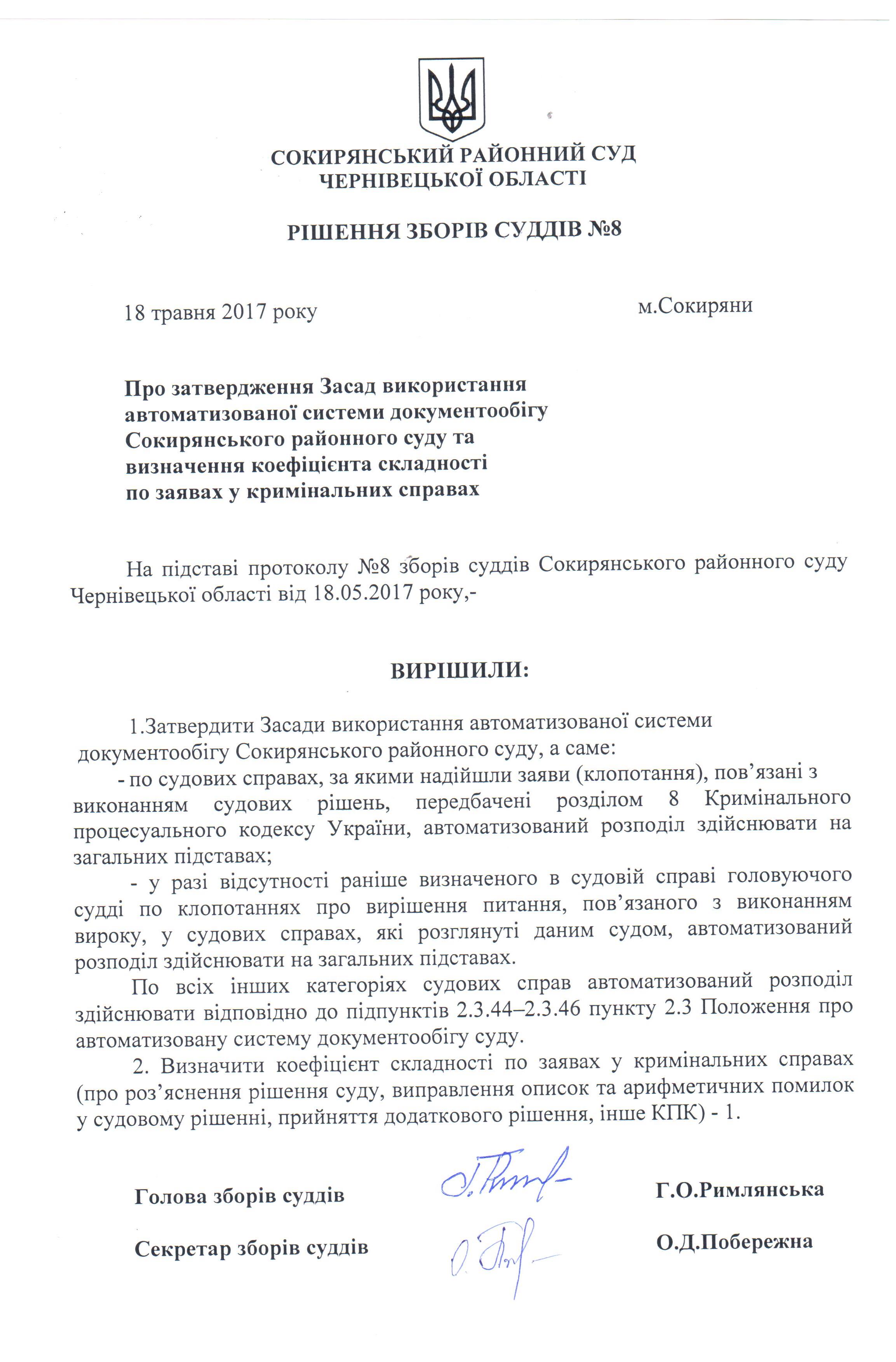 Рішення зборів № 8 (Про затвердження Засад використання автоматизованої системи документообігу Сокирянського районного суду та визначення коефіцієнта складності по заявах у кримінальних справах)