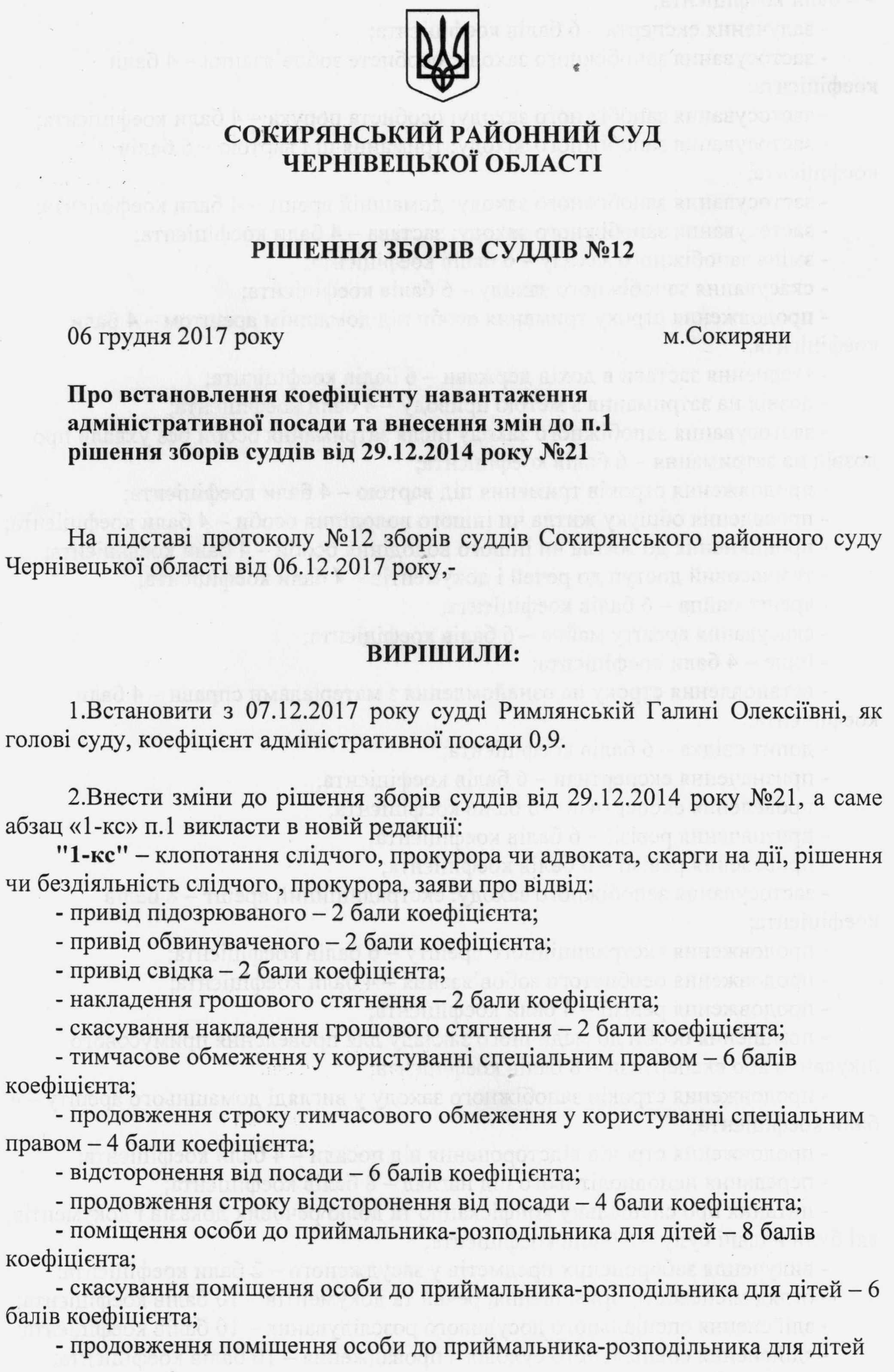 Рішення зборів № 12 (Про встановлення коефіцієнту навантаження адміністративної посади та внесення змін до п.1 рішення зборів суддів від 29.12.2014 року №21))