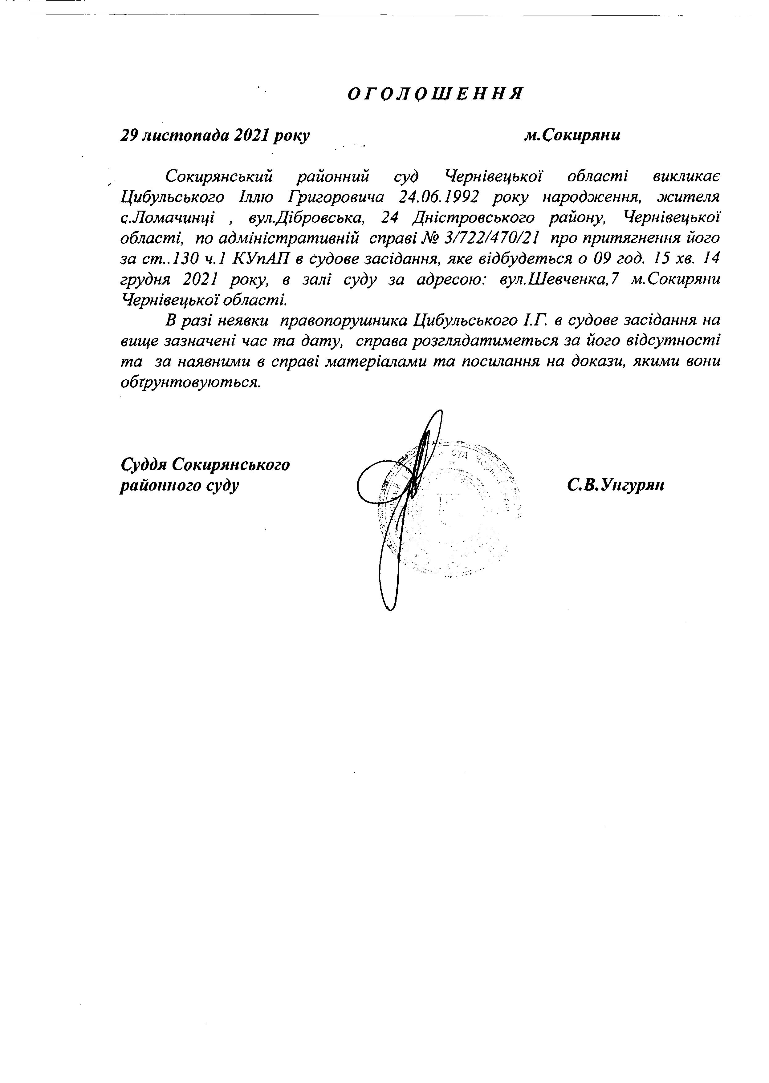 Оголошення про виклик до суду Цибульського Іллю Григоровича
