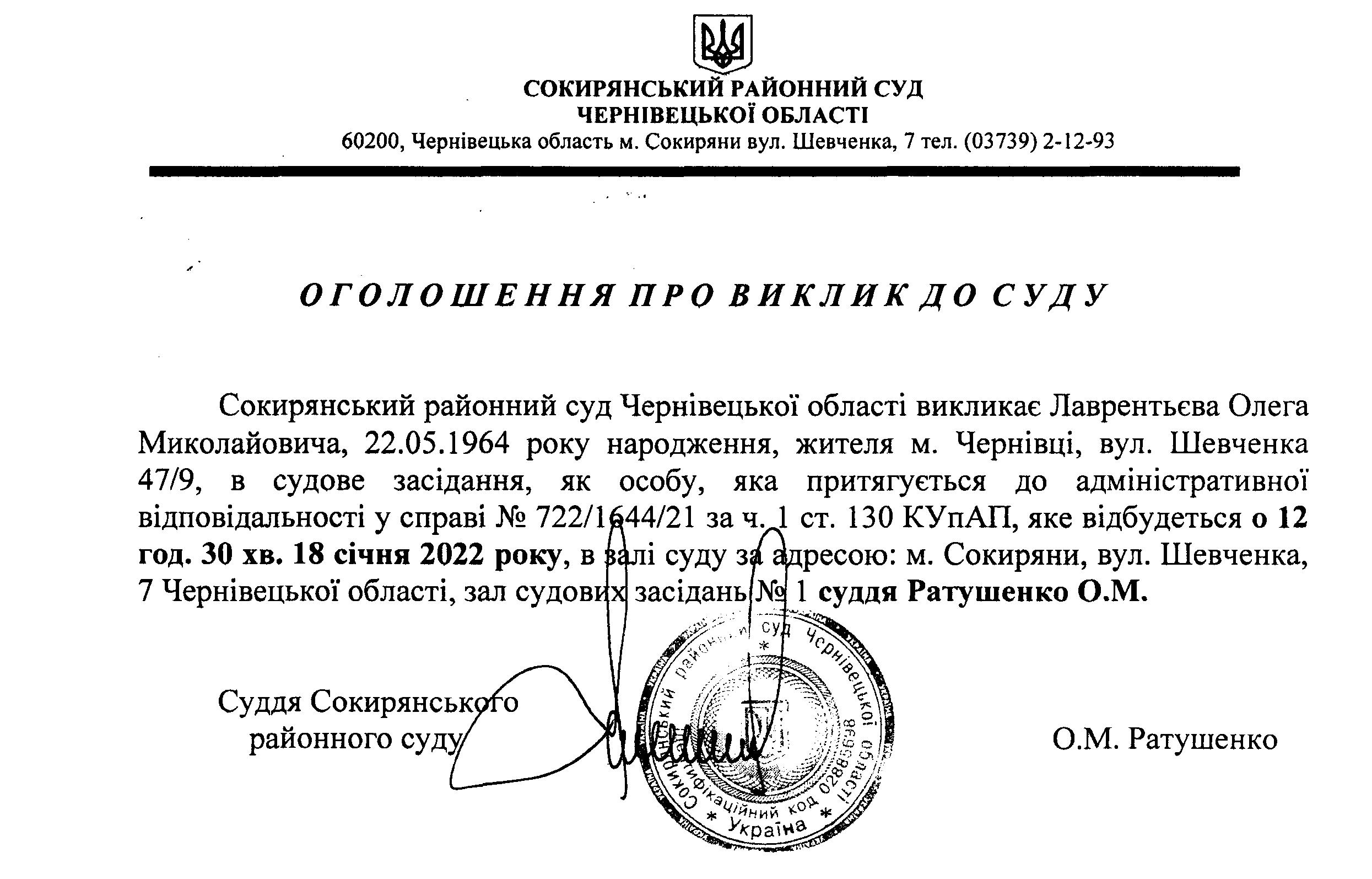 Оголошення про виклик до суду Лаврентьєва Олега Миколайовича