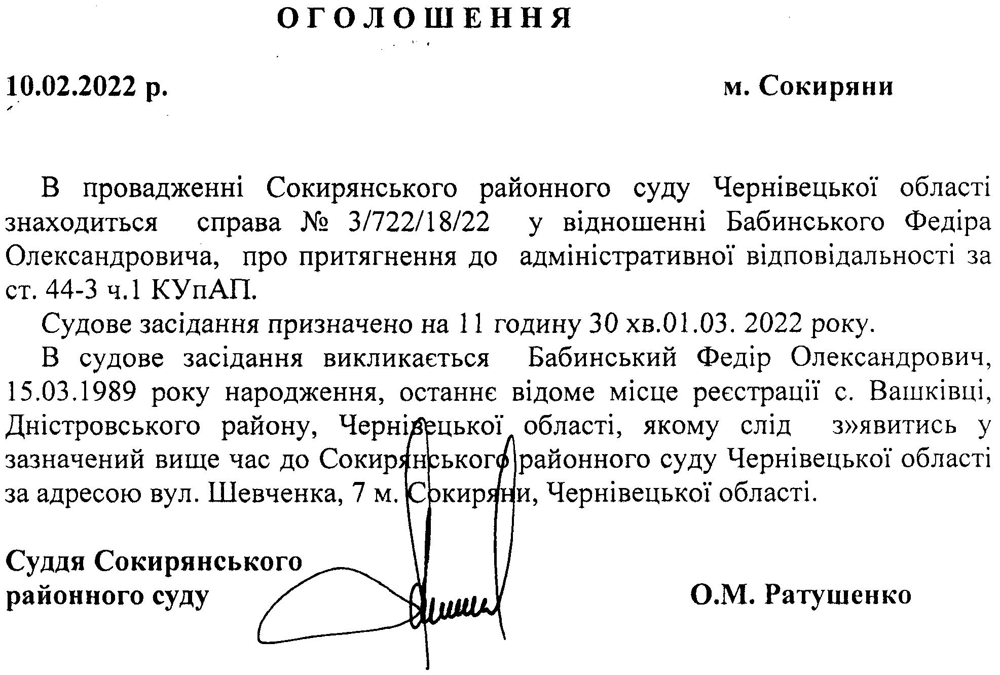 Оголошення про виклик до суду Бабинського Федіра Олександровича