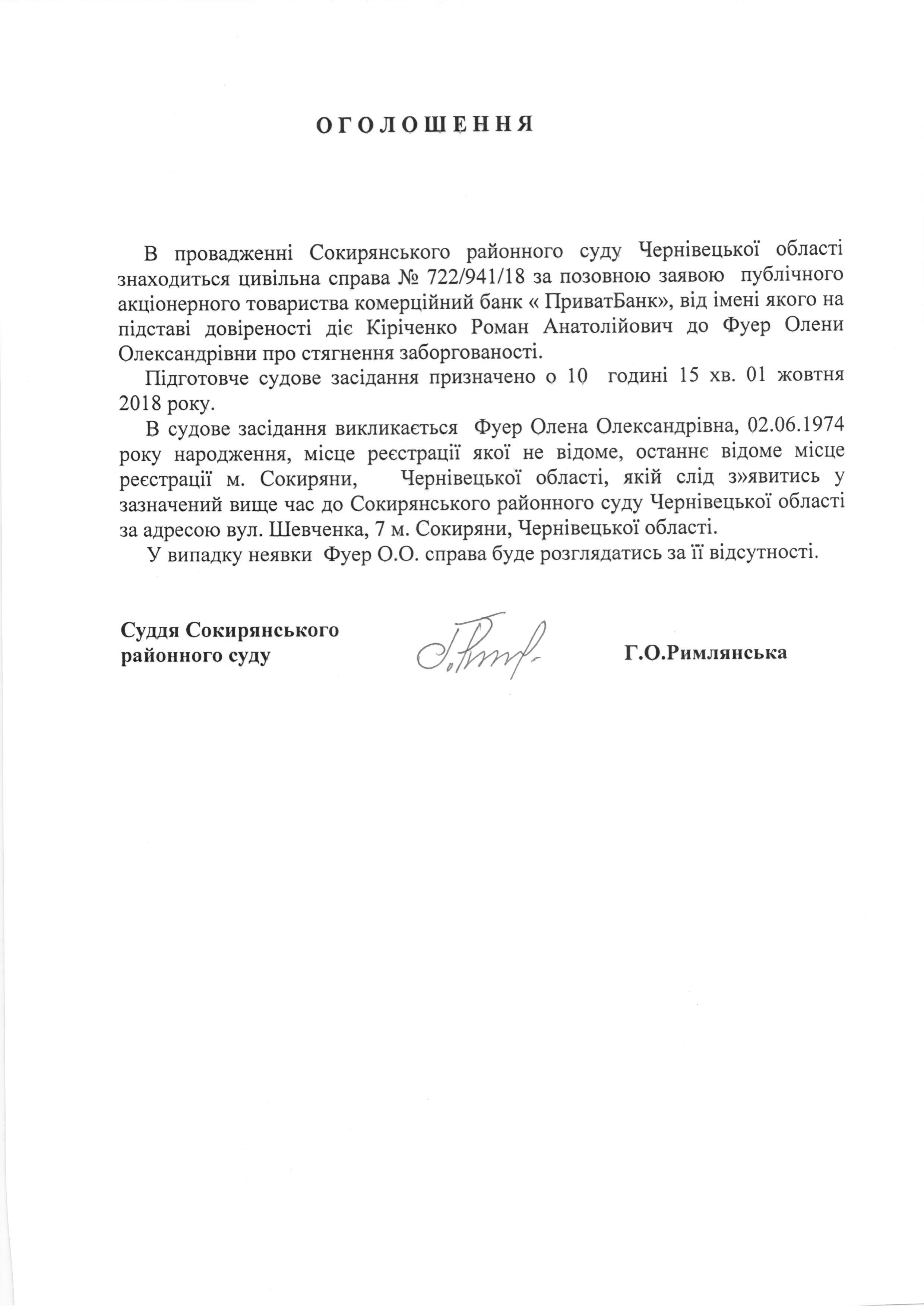 ОГОЛОШЕННЯ ПРО ВИКЛИК ДО СУДУ КІРІЧЕНКО РОМАН АНАТОЛІЙОВИЧ