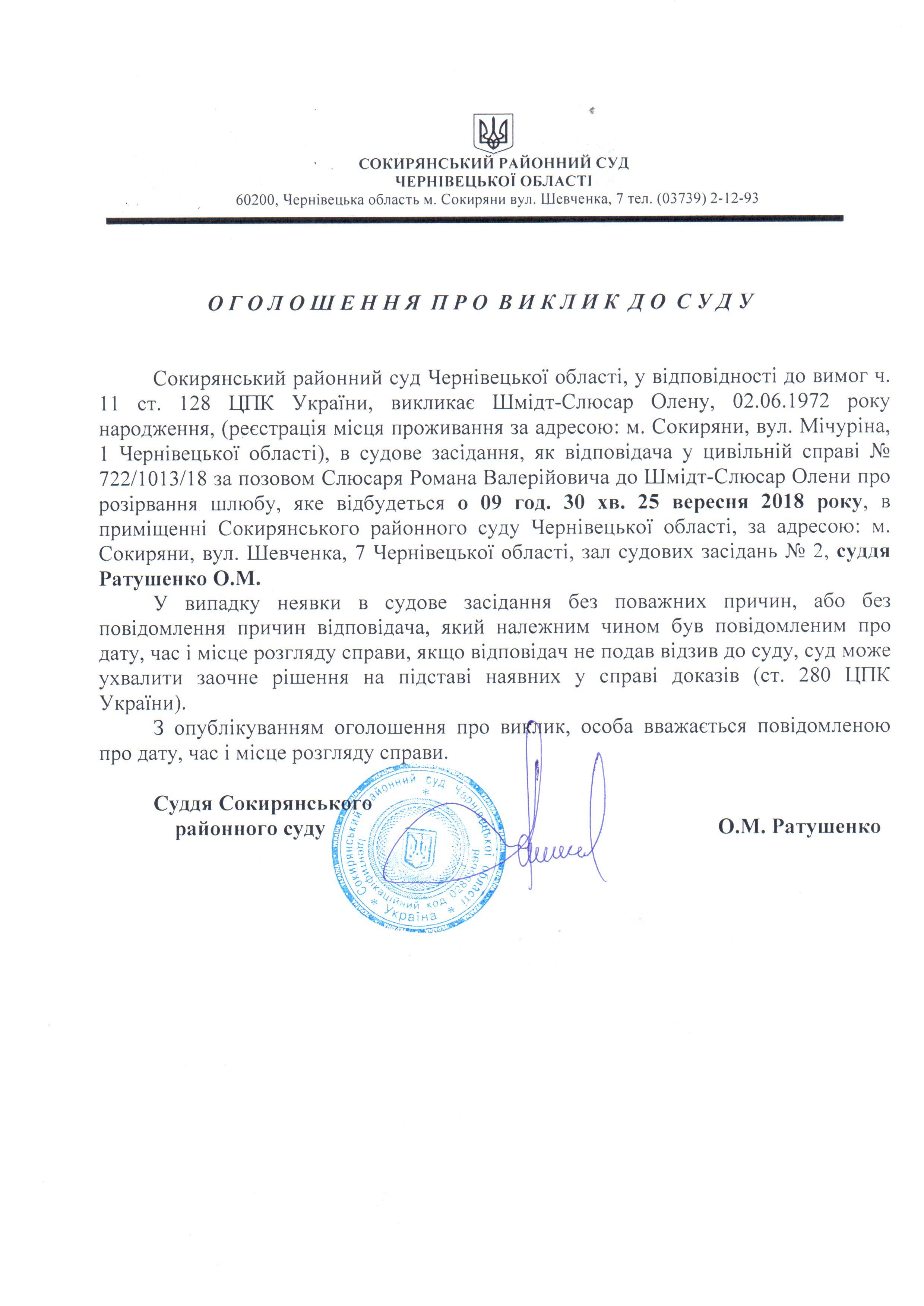 ОГОЛОШЕННЯ ПРО ВИКЛИК ДО СУДУ ШМІДТ-СЛЮСАР
