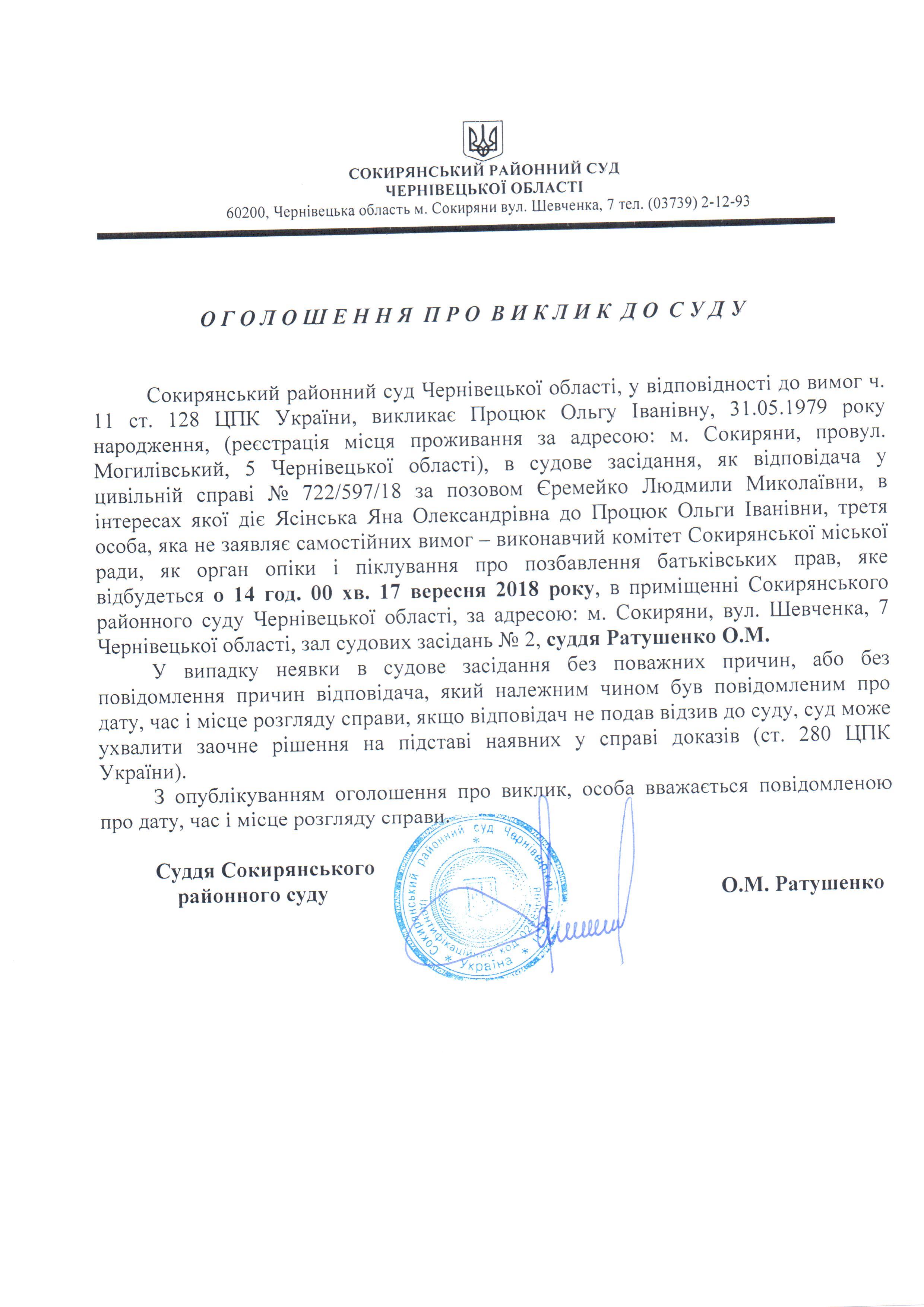 ОГОЛОШЕННЯ ПРО ВИКЛИК ДО СУДУ ПРОЦЮК ОЛЬГУ ІВАНІВНУ