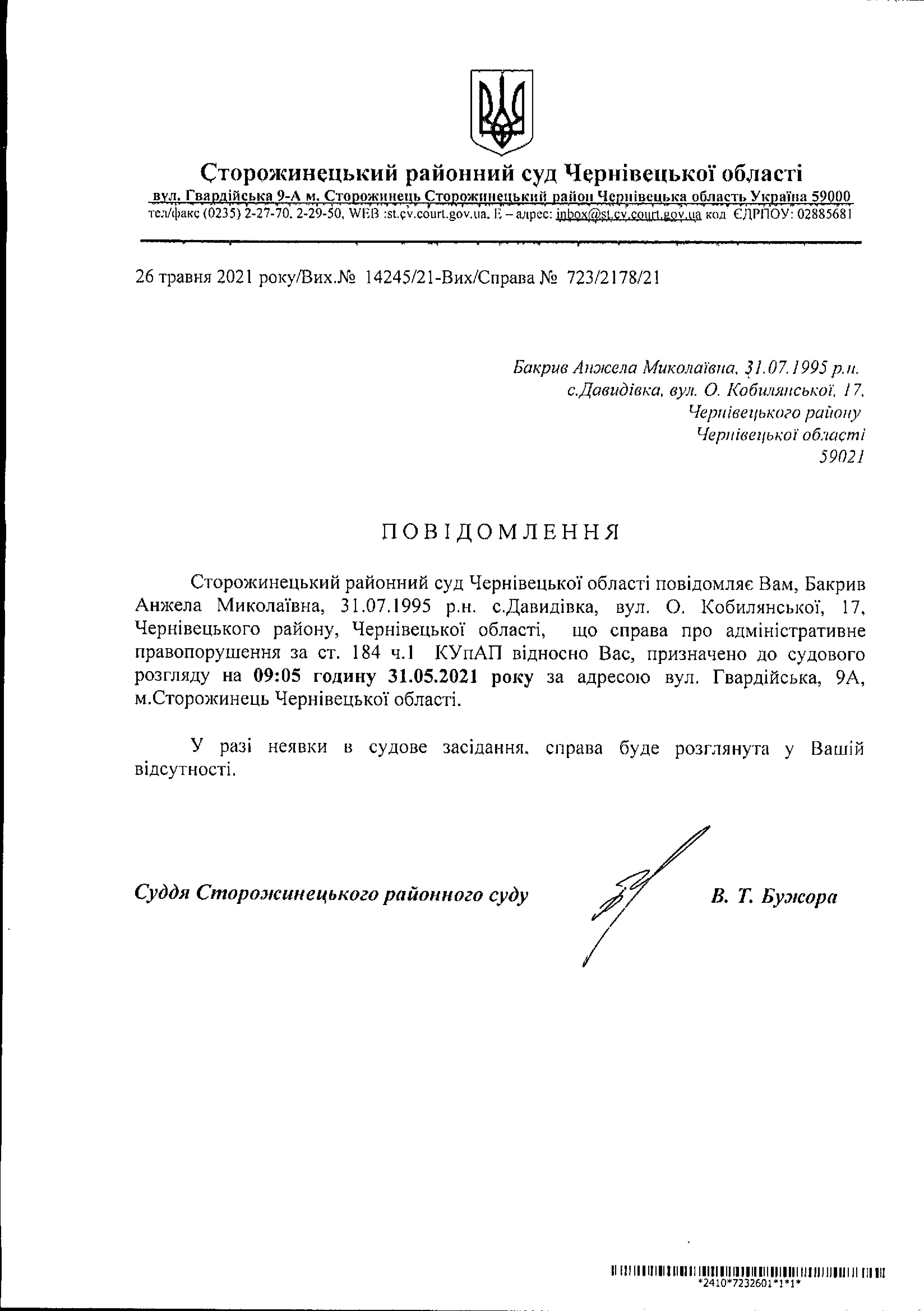 Оголошення про виклик до суду Бакрив Анжелу Миколаївну